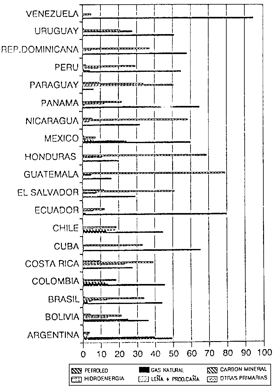 * Guatemala, no obstante ser un país con producción de petróleo, integra su OTEP con un 71,9 por ciento de LEÑA y un 7,1 por ciento de otros bioenergéticos.* Argentina país productor de petróleo, y Venezuela país petrolero, exhiben los niveles más bajos de participación de la LEÑA y de los otros bioenergéticos en sus respectivas OTEP, no obstante ser altos generadores de residuos forestales tanto en la actividad extractiva de especies maderables para la industria y aprovechamientos menores, como en la discutible expansión "externa" de la "frontera agrícola".