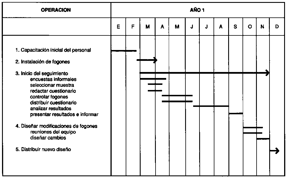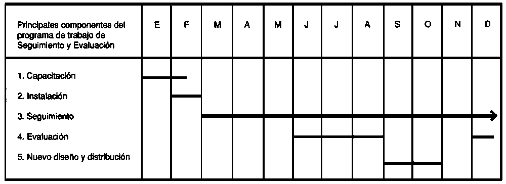 Una vez especificadas las actividades, determinar quiénes han de realizarlas, qué equipo necesitarán y cuáles serán los costos. Las personas a quienes se asignen tareas particulares de seguimiento no deben tener otras tareas asignadas para el mismo período. La Figura 3.1 muestra cómo puede presentarse esta información. Los recursos mínimos necesarios son:1) Un mínimo del 1 al 4 por ciento del presupuesto total; en la fase inicial de ensayos en los hogares el seguimiento puede requerir el 30 por ciento.2) Del 30 al 50 por ciento del tiempo de los diseñadores durante los tres primeros meses de ensayos en los hogares.