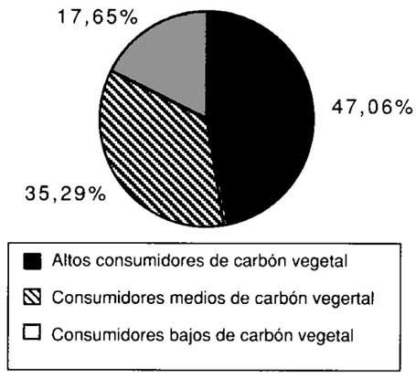 La Figura 3.6 es un gráfico circular que indica el uso de carbón vegetal en hogares que han adquirido el nuevo fogón en comparación con otros que no lo han comprado. Los datos revelan que la mayor parte de quienes tienen el nuevo fogón utilizan el carbón vegetal como combustible principal. Quienes no lo tienen utilizan sobre todo otros combustibles como gas, querosén y leña.