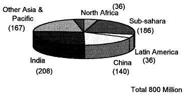 Yet, over 500 million Asians are chronically undernourished, accounting for about two - thirds of the worlds hungry people (Figure 1). Child malnutrition exacts its highest debilitating toll in Asia and the Pacific region, especially South Asia. Likewise, nearly 800 million persons, two - thirds of the worlds poor, have their homes here. It is disquieting that in the recent years the number of hungry and poor people has not been decreasing but remains stubbornly high. Production growths are low and stagnating; moreover, increased agricultural production in the region has often been associated with environmental degradation such as erosion of topsoil, salinization, depletion of soil fertility, lowering of he water table and a fast decline in water availability, waterlogging, pollution of water bodies, eutrophication, build - up of greenhouse gases, ecosystem acidification and loss of biodiversity. Given that the per capita availability of land Asia and the Pacific region is one - sixth of that in the rest of the world, and that nearly three - fifths of the future increase in world population will occur here, future increases in food and agricultural production must be realized from ever - shrinking and generally deteriorating land, water and other production resources. This is indeed an uphill task.