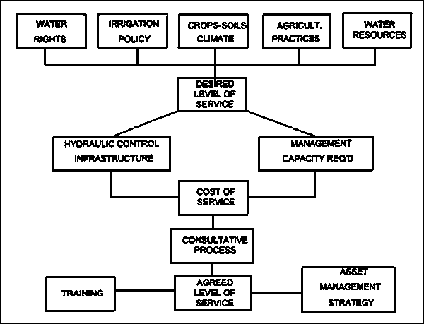 There is a general acceptance of the principle that water management institutions should be consistent with hydraulic management units, either at the basin, system levels or within the systems, and in practice the configuration of the irrigation systems has had a great influence on the design on PIM/IMT programmes. Other important linkages are related to the setting of objectives for the irrigation systems. Relevant to IMT would be among others the determination of cropping patterns by a previously top - down institution and of the service to be delivered to farmers and on the other hand the necessity to manage water supply and drainage effluents in a river basin/integrated water resources management perspective rather than for the single purpose of irrigating crops.