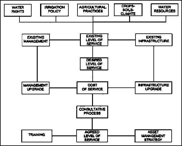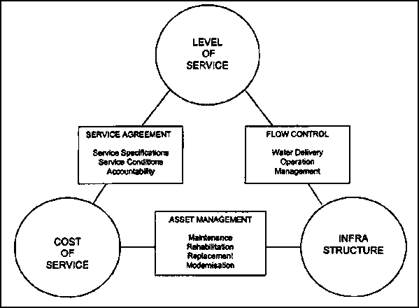 There is a wide range of levels of irrigation service, and the nature of the service may vary significantly from a highly flexible service differentiated at the farm level to an inflexible service provided on an undifferentiated basis to a large number of farmers. It is therefore important to qualify the level of service. The levels of service may be different at each layer. It is also important not only to identify what the existing level of service is, but also what the expectations are at each layer of operation. In service - oriented water management, the decision on the level of service against the cost for providing this service, from ISP to WUAs and WUAs to users, is expressed through service agreements which are the foundation of an asset management strategy and managerial capacity upgrading programmes which are translated into financial plans. Service agreements may be a modality to force a negotiation on service levels and initiate a process towards a transformation of top - down irrigation agencies by providing accountability and transparency.