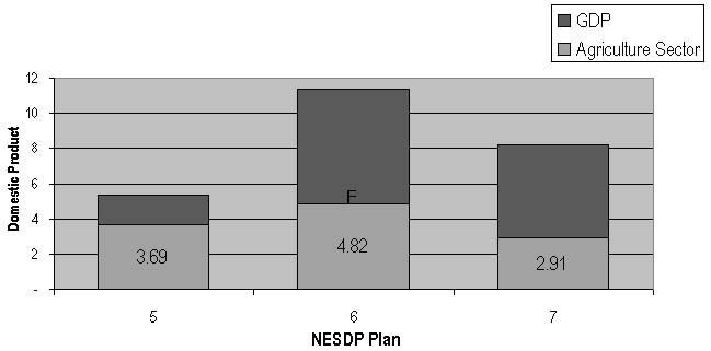 Under its three most recent National Economic and Social Development Plans - the Fifth, Sixth and Seventh plans respectively - Thailand experienced a satisfactory expansion of its Gross Domestic Product (Table 1). Agriculture accounted for 69, 42 and 35 percent respectively in these plans, demonstrating that the agricultural sector is a very important but a not very efficient part of Thailand's national economic system.