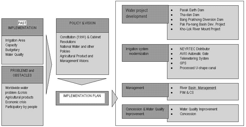 Different conditions in the past together with the economic crisis of the country and the other factors in guidelines, measurement, policy and vision such as constitution 1997, national water policy, vision frame in natural resources management, agricultural productivity, and farmers participation in the management and cost sharing. Therefore, Thailand must change its concept of water resources development from quantitative qualitative orientation. Implementations include increased irrigation efficiency, quantity of irrigation water, promotion in farmers participation for water management.