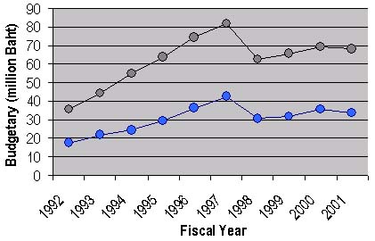 Although Thailand's irrigation water requirement was projected to increase at the rate of 1.1 billion m3 per year, average annual water resources capacity increased only 0.97 million m3 (Khon Kaen University, 1986). Water shortage trends indicated above together with the slowing rate of expansion of new irrigated areas (Table 7) illustrate Thailand's difficulty in fulfilling its water demand. At the same time, environmental conservation is getting favourable attention in regard to water resource management.