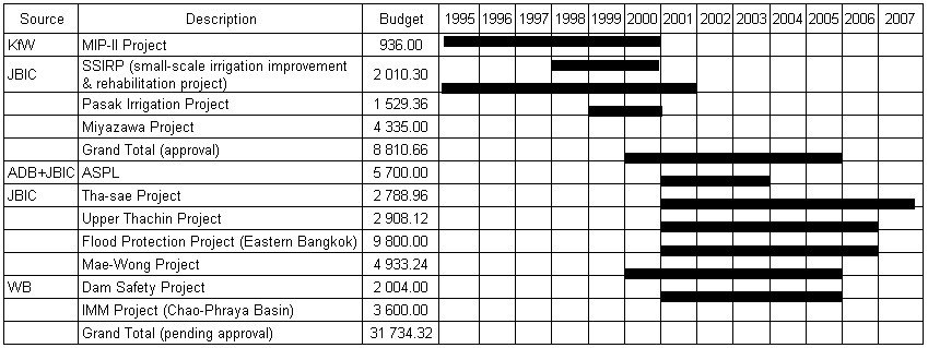 Expansion of irrigation area shown in Table 7 reflects the difficulty in building new water storage in support of rapidly rising water demand. However, Thailand continues to develop new water storage to support extended agricultural productivity. Existing irrigation projects are: