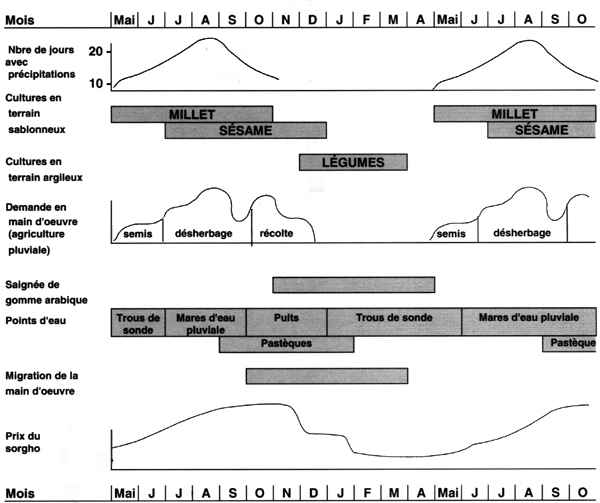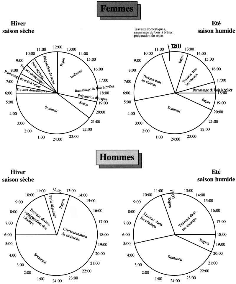 calendrier saisonnier, diagramme des activités journalières, tendances dans le temps, profil traditionnel |