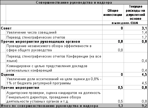 5) В таблице 1 показаны расходы, связанные с улучшением руководства и надзора. Хотя инвестиционные расходы не очень велики (1,3 млн. долл. США), сумма текущих расходов на двухлетней основе достаточно значительна и составляет 9,2 млн. долл. США в двухлетний период. В категории руководства существенное возрастание расходов связано с Советом, на дополнительные совещания и перевод стенографических отчетов которого отведено 3,1 млн. долл. США. Другое крупное увеличение расходов в данной категории вызвано повышением внимания к проведению оценки, на нужды которой отводится, по меньшей мере, 0,8% бюджета регулярной программы, что приводит к росту расходов в двухлетний период на 4,5 млн. долл. США.