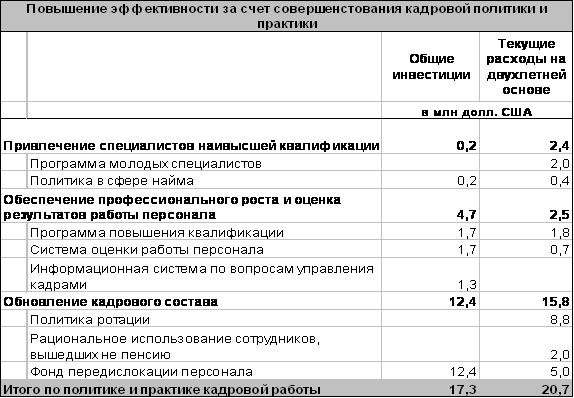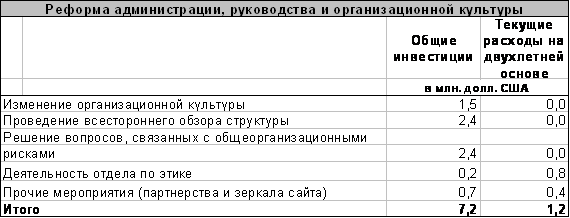 9) Элементы в таблице 4, связанные с реформой администрации, руководства и организационной культуры, потребуют сравнительно крупных инвестиций (7,2 млн. долл. США), но их реализация приведет, как предполагается, к значительному улучшению методов работы.