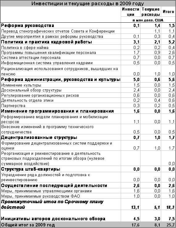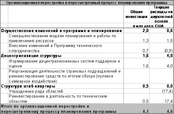 8) Несмотря на относительно небольшие объемы общих расходов (4,1 млн. долл. США – инвестиции и 4,6 млн. долл. США – текущие расходы), связанных с организационной перестройкой и пересмотренным процессом планирования программы (таблица 3), изменения, обеспеченные этими средствами, значительны по масштабу. Например, в результате перестройки структуры штаб-квартиры удастся значительно оптимизировать и сократить управленческую структуру, а сэкономленные средства реинвестировать в технические программы (17,4 млн. долл. США). Изменение процесса планирования позволит усовершенствовать мобилизацию ресурсов и обеспечить основу для проведения более эффективных оценок программы. Соответствующие изменения в Программе технического сотрудничества, когда они будут полностью осуществлены, будут обеспечивать экономию расходов (0,9 млн. долл. США в каждый двухлетний период).