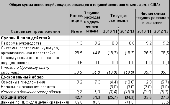 14) В таблице 7 обобщены все расходы и экономия средств, приведенные в таблицах 1-6. Здесь данные по СПД об экономии представлены отдельно от расходов (за счет упразднения должностей будет сэкономлено 17,4 млн. долл. США, а за счет внесения изменений в программу технического сотрудничества – 0,9 млн. долл. США). Общая сумма инвестиций, необходимых в последующие три года, составит по оценкам порядка 42,7 млн. долл. США. Проведенные изменения будут сопровождаться текущими расходами на сумму 61,3 млн. долл. США. Однако после поэтапной реализации определенных мероприятий эта сумма сократится за счет экономии, которая составит 34,3 млн. долл. США. В конечном итоге бюджет прирастет на 27 млн. долл. США. Эти данные сравниваются с общими (средними) инвестиционными расходами в 69 млн. долл. США, намеченными авторами НВО, и с приращением бюджета в 22,5 млн. долл. США.