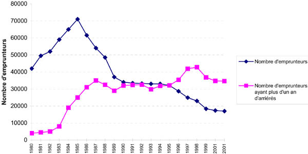 Programme de crédit aux petits exploitants agricoles: Nombre d'emprunteurs et nombre d'emprunteurs ayant plus d'un an d'arriérés (1980 - 2001)