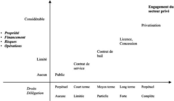 La sous-traitance par le secteur public se réfère à un processus de délégation par contrat à des entités indépendantes de fonctions assumées au préalable par une organisation publique. Ces entités sont en général des compagnies privées, mais aussi, bien que plus rarement, des organisations à but non lucratif. Le schéma ci-joint montre tout un ensemble d'options qui vont depuis la fourniture de biens et services par le secteur public jusqu'à la privatisation. Ces options, présentées en continuum, montrent un transfert de droits et une délégation progressive du secteur public vers le secteur privé parallèlement à un engagement croissant de ce dernier.