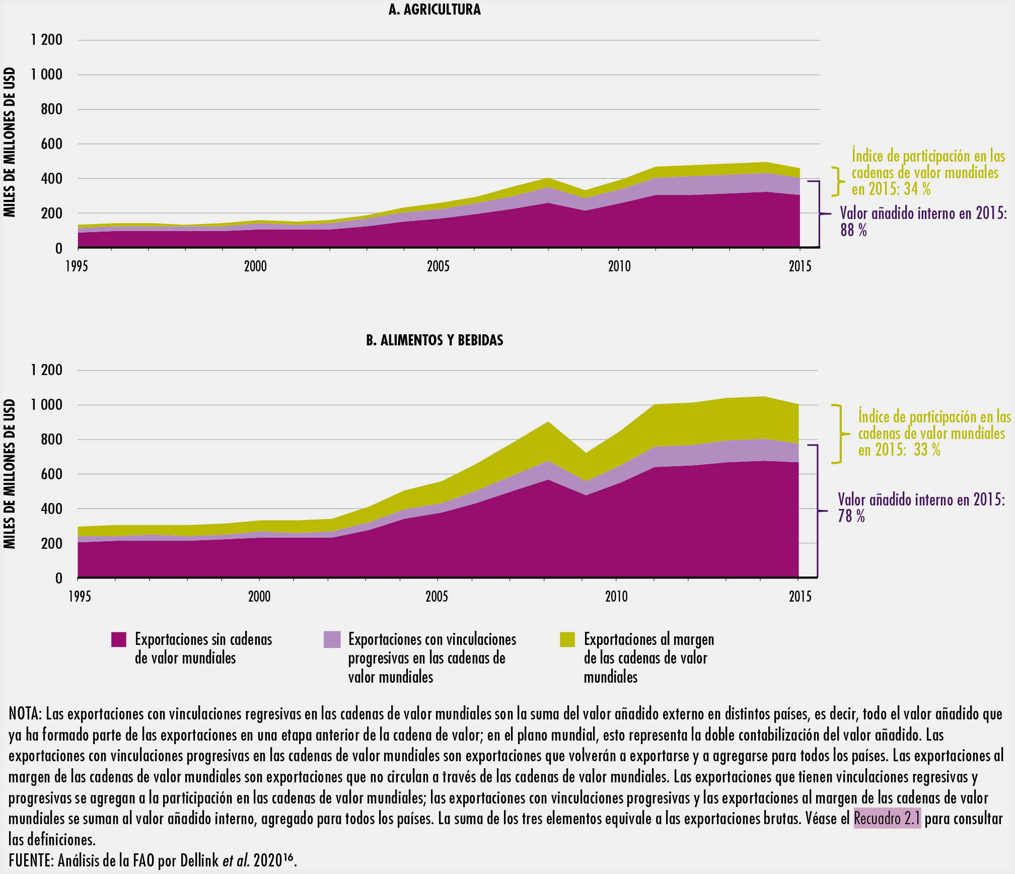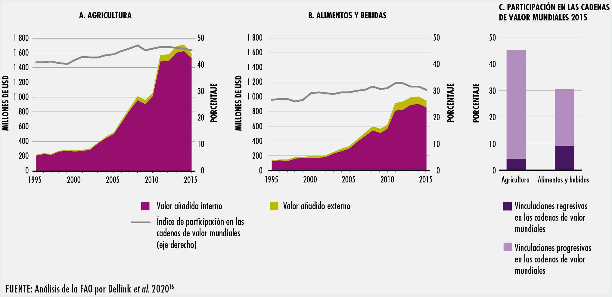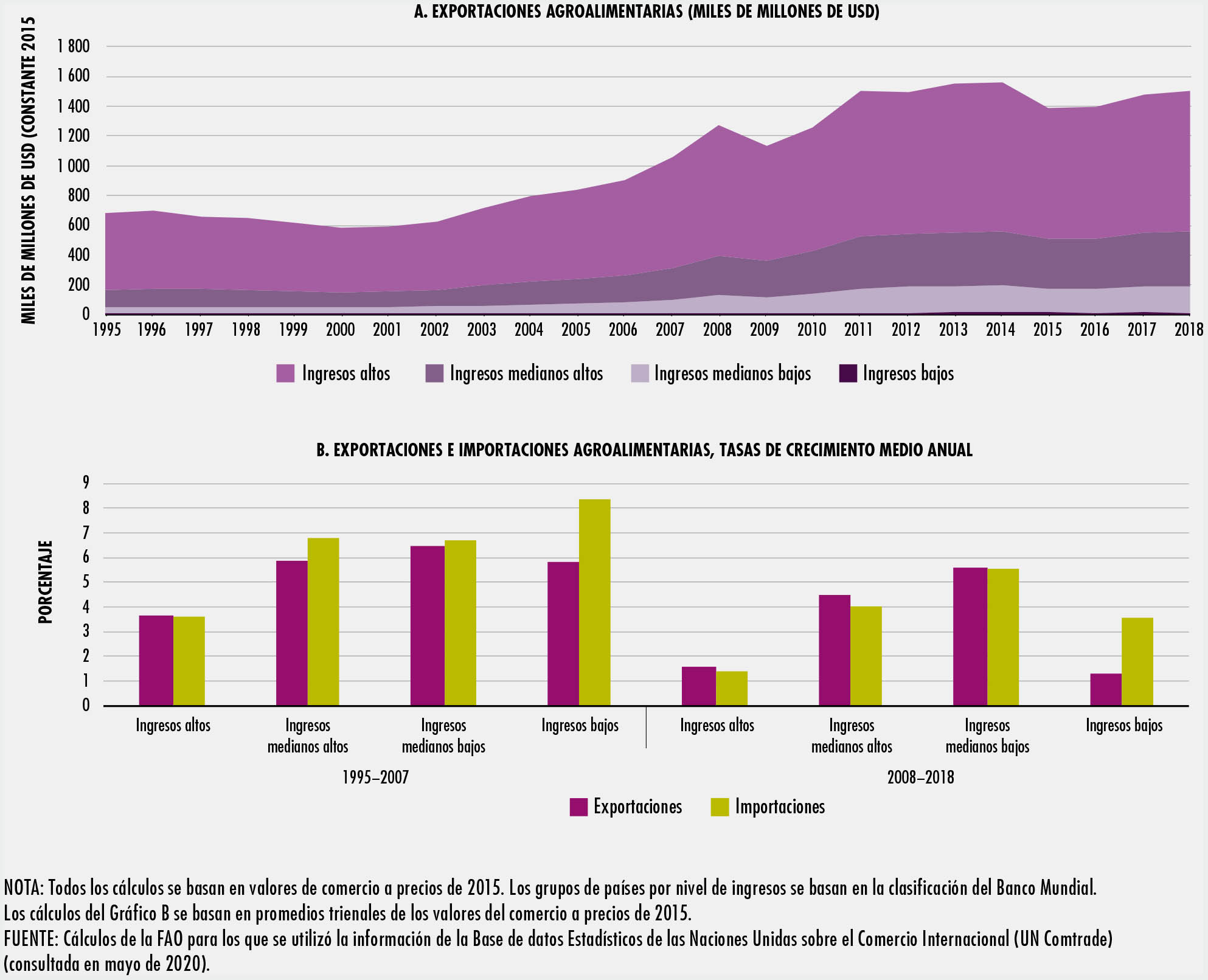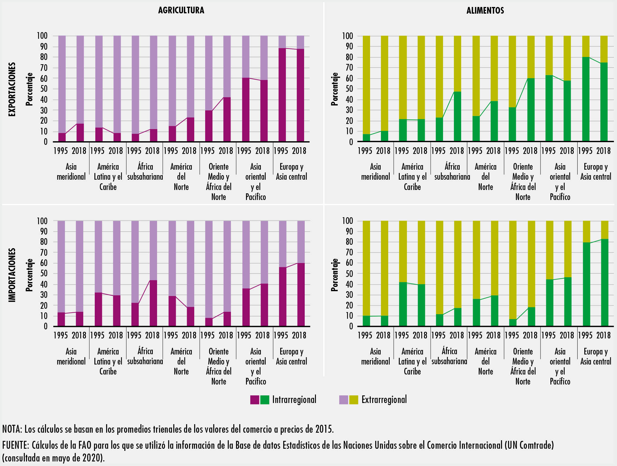 El comercio en los sectores de la alimentación y la agricultura se ha duplicado con creces desde 1995. Los países emergentes y en desarrollo han participado de forma activa en los mercados mundiales y en la actualidad representan un tercio del comercio mundial. Los avances tecnológicos han hecho posible transformar los procesos de producción y comercio, lo que a su vez ha posibilitado la aparición de cadenas de valor mundiales en la alimentación y la agricultura. En el SOCO 2020 se estima que más de un tercio de las exportaciones mundiales de productos agrícolas y alimentarios son objeto de comercio en una cadena de valor mundial.