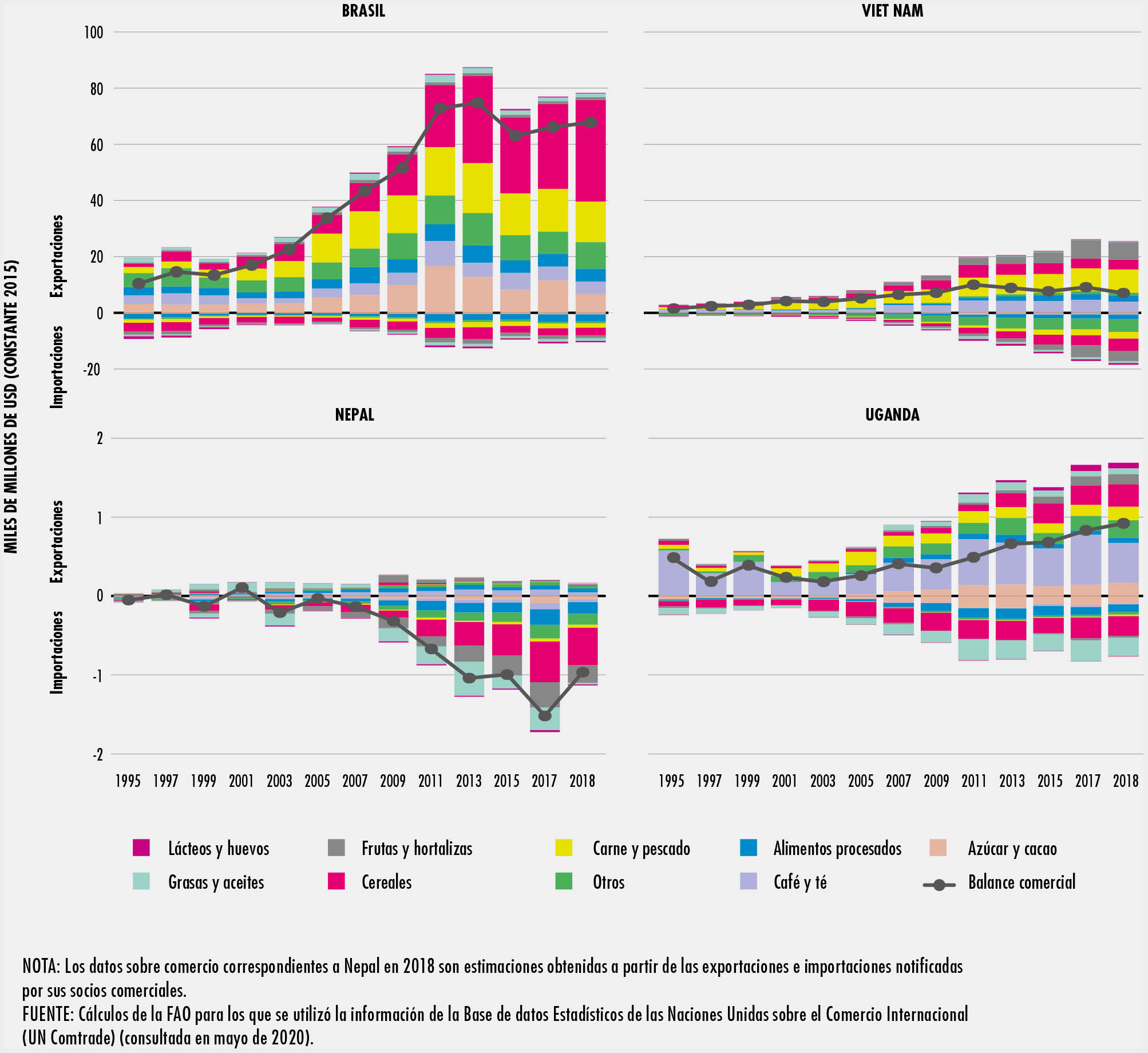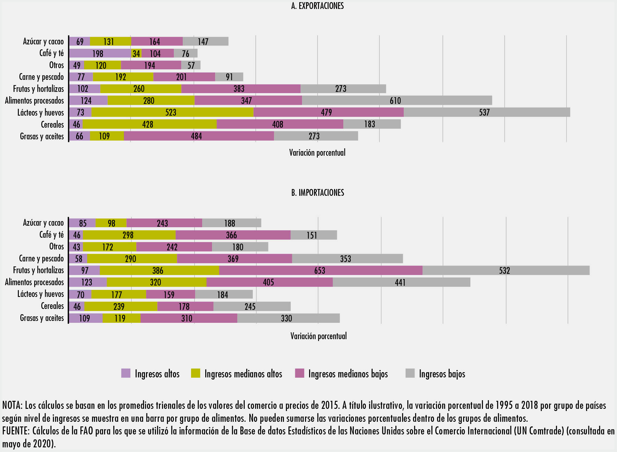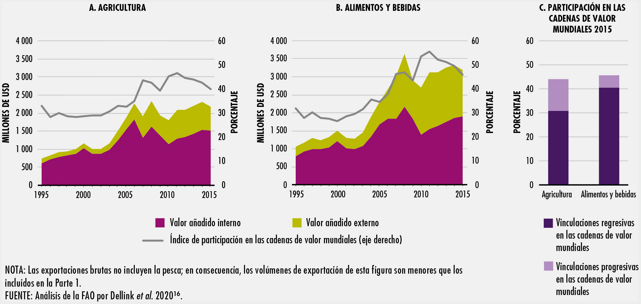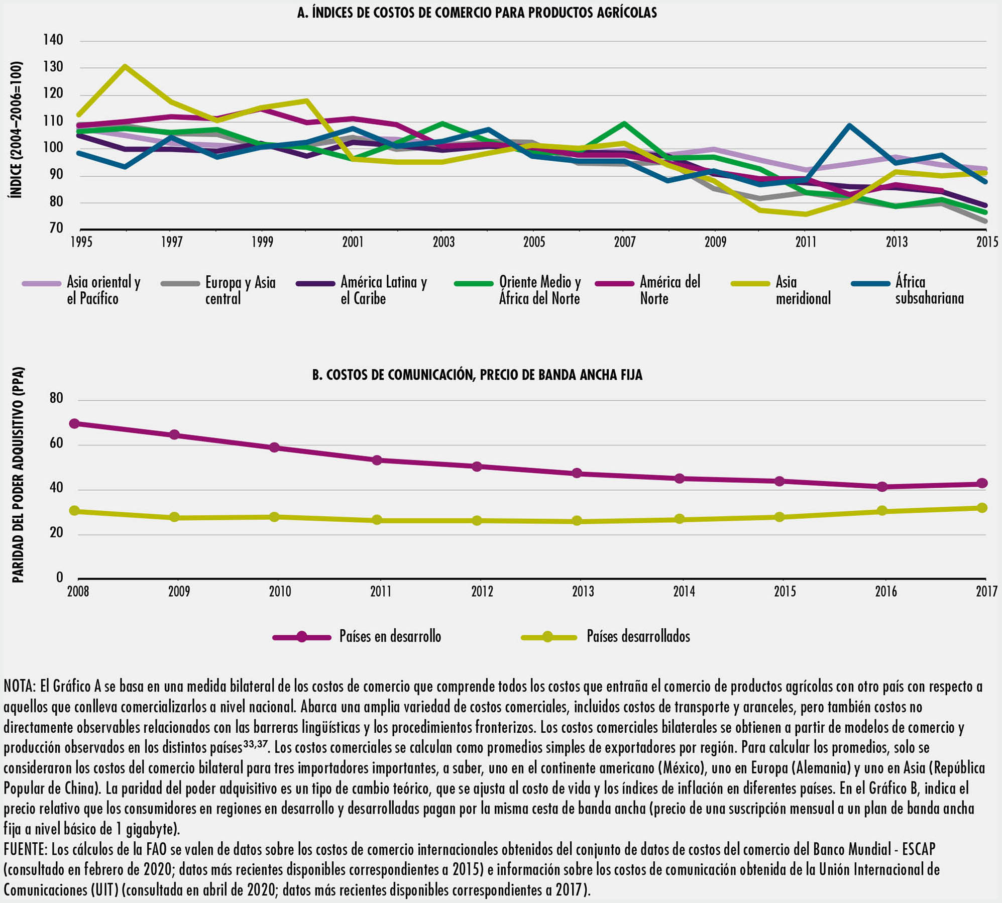 El comercio en los sectores de la alimentación y la agricultura se ha duplicado con creces desde 1995. Los países emergentes y en desarrollo han participado de forma activa en los mercados mundiales y en la actualidad representan un tercio del comercio mundial. Los avances tecnológicos han hecho posible transformar los procesos de producción y comercio, lo que a su vez ha posibilitado la aparición de cadenas de valor mundiales en la alimentación y la agricultura. En el SOCO 2020 se estima que más de un tercio de las exportaciones mundiales de productos agrícolas y alimentarios son objeto de comercio en una cadena de valor mundial.