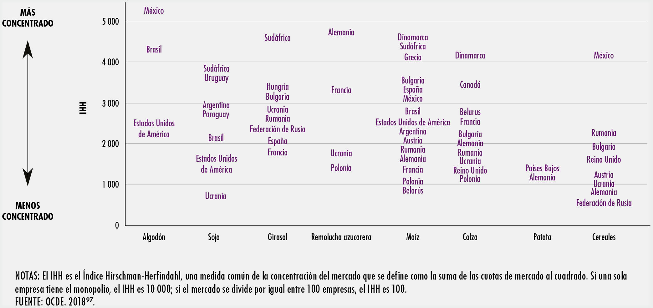 2.13 Grado de variación de la concentración del mercado de semillas por cultivo y región