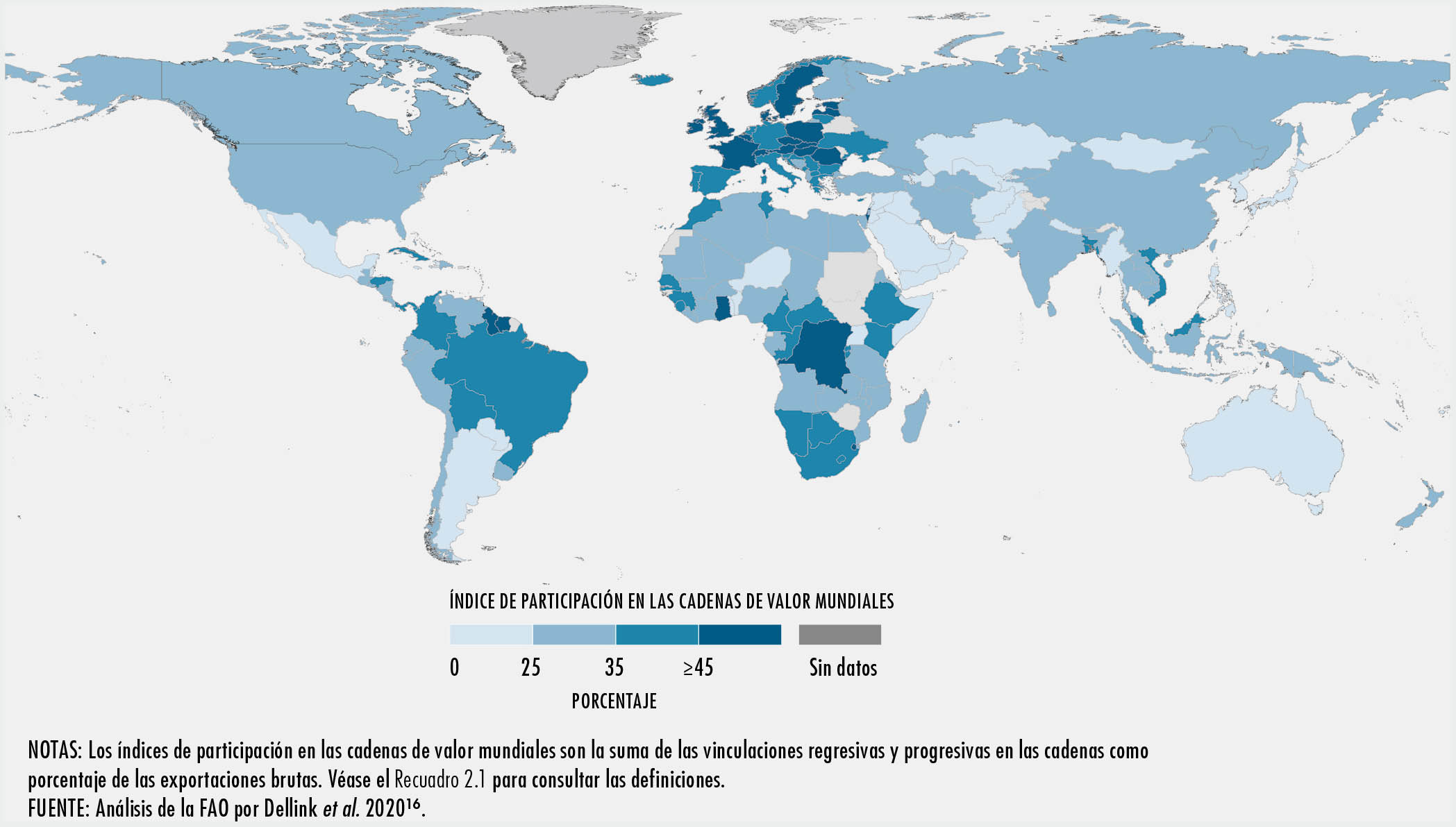 2.2 Índices de participación del sector agrícola en las cadenas de valor mundiales en 2015