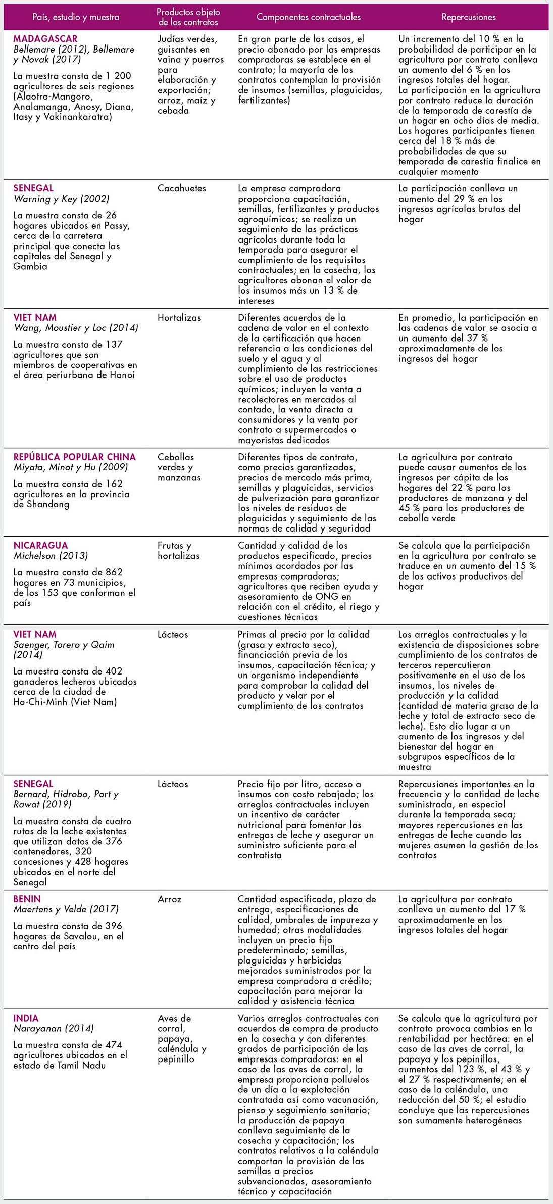 3.1 Estudios sobre agricultura por contrato examinados en este informe