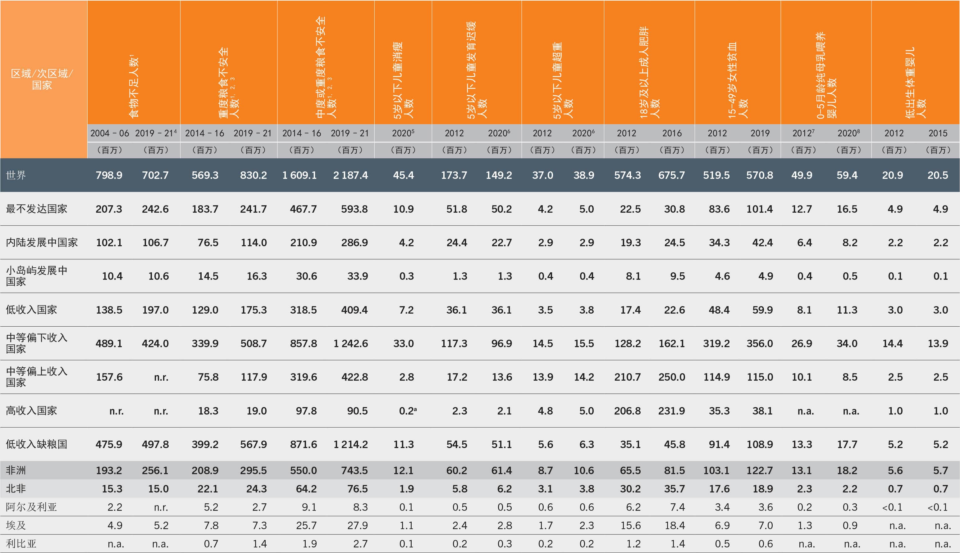 表A1.2可持续发展目标和全球营养目标实现进展:受食物不足、中度或重度粮食不安全和特定形式营养不良影响的人数; 纯母乳喂养的婴儿人数和低出生体重的婴儿人数