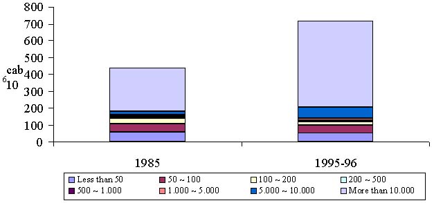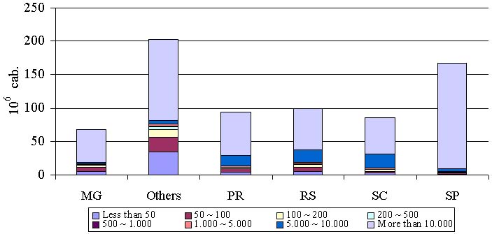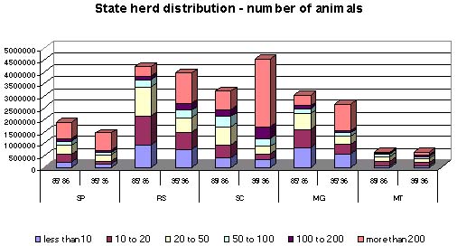 In the future, the expansion of the poultry production will be mostly based on larger farms located closer to the regions that produce soybean and maize. The evolution of the estimated quantity of chicken in Brazil per stratum of flock size between 1985 and 1995/96 shows that most of the growth is observed in the larger farms and the size of the chicken flock did not grow much in the strata of flocks smaller than 10 thousand chickens.