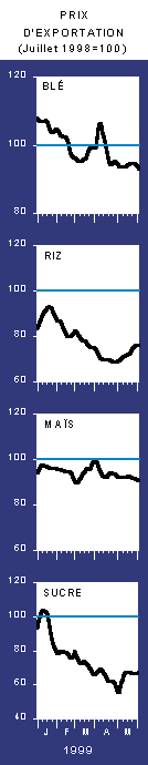 Les dernières indications laissent toujours entrevoir une réduction de la production céréalière en 1999 et une légère détérioration des perspectives concernant les disponibilités céréalières pour la prochaine campagne de commercialisation de 1999/2000. Si les prévisions actuelles se matérialisent, la production céréalière de 1999 ne permettra pas de satisfaire les besoins de consommation escomptés en 1999/2000 et il faudra puiser dans les stocks mondiaux de céréales accumulés au cours des trois dernières campagnes. Une crise humanitaire majeure persiste en Europe, où des milliers de réfugiés ont continué de fuir la province du Kosovo, en République fédérative de Yougoslavie, ces dernières semaines. Par ailleurs, de graves problèmes d'approvisionnements alimentaires persistent dans plusieurs pays d'Afrique, d'Asie et d'Amérique latine (voir, page 4, encadré sur les situations alimentaires d'urgence). Selon les dernières prévisions de la FAO, la production céréalière mondiale en 1999 devrait s'établir à 1 858 millions de tonnes, soit 1,3 pour cent de moins que l'an dernier. La production de blé serait de 579 millions de tonnes, soit un recul de 2,6 pour cent par rapport à 1998 et un chiffre inférieur à la tendance, et celle de céréales secondaires de 891 millions de tonnes, soit 1,5 pour cent de moins que l'an dernier et un chiffre également inférieur à la tendance. La production mondiale de riz (usiné), selon des estimations préliminaires, devrait augmenter de 1,4 pour cent pour se situer à 387 millions de tonnes. Les premières prévisions de la FAO permettent de penser que les échanges mondiaux de céréales se chiffreront à 212 millions de tonnes en 1999/2000, soit 5 millions de tonnes de plus qu'en 1998/99. Le commerce mondial de blé devrait augmenter d'environ 5 pour cent pour s'établir à 100 millions de tonnes, et celui des céréales secondaires de près de 2 pour cent avec 92 millions de tonnes. En revanche, le commerce du riz devrait ralentir compte tenu de l'amélioration des perspectives de production dans plusieurs des principaux pays importateurs. Les cours internationaux du blé et des céréales secondaires ont encore fléchi depuis mars, en raison surtout de l'atonie persistante de la demande sur les marchés internationaux et des conditions de végétation dans l'ensemble satisfaisantes pour les récoltes de 1999. Les cours internationaux du riz ont chuté en avril, mais se sont quelque peu redressés en mai soutenus par le raffermissement de la demande d'importation. La production mondiale de légumineuses devrait augmenter en 1999 pour s'établir à 58,5 millions de tonnes. Les importations mondiales de légumineuses devraient elles aussi être fermes, la hausse des expéditions pour la consommation alimentaire directe compensant largement la baisse des échanges de haricots destinés à l'alimentation animale. Les cours des lentilles et des pois-chiches devraient être fermes en 1999 mais les perspectives concernant les autres légumineuses sont mitigées. Selon les estimations de la FAO, la production mondiale de sucre de 1998/99 s'établit à 129,6 millions de tonnes, soit une progression de 6,5 pour cent par rapport à la campagne précédente. A ce niveau, la production excéderait la demande pour la quatrième année consécutive et les stocks continueraient à augmenter. En raison de l'offre excédentaire sur les marchés internationaux, les cours du sucre ont poursuivi leur repli important pendant cette campagne. |