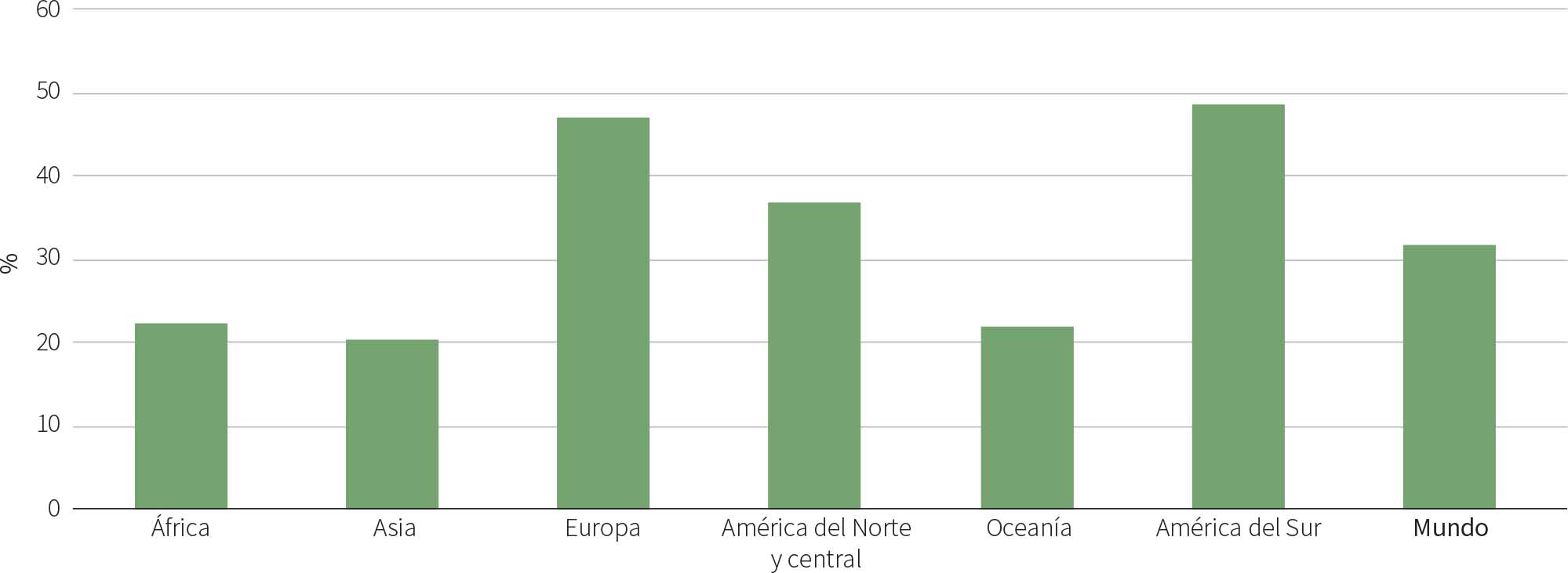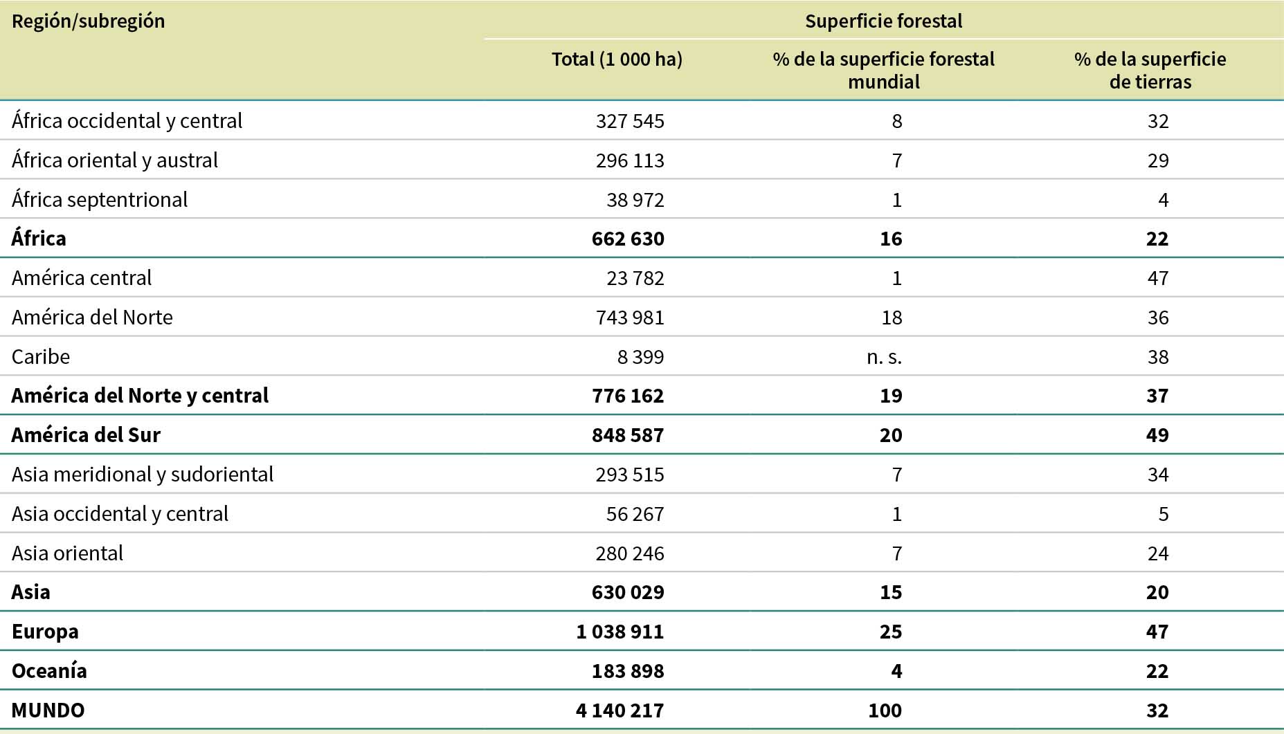La superficie forestal mundial en 2025 se estima en 4 140 millones de hectáreas (ha), lo que representa el 32 % del territorio total. Esta superficie equivale a 0,50 ha de bosque per cápita6, aunque los bosques no se distribuyen de forma equitativa entre las personas del planeta o geográficamente. El 45 % de los bosques del mundo se encuentra en la región climática tropical, el 28 % en la boreal, el 17 % en la templada y el 11 % en la subtropical (Figura 2). En el Cuadro 2 se muestra la distribución de la superficie forestal a escalas regional y subregional. Europa representa el 25 % de la superficie forestal mundial, seguida por América del Sur (20 %), América del Norte y central (19 %), África (16 %), Asia (15 %) y Oceanía (4 %). En la Figura 3 se muestra la superficie forestal como porcentaje del territorio total por región, y en la Figura 4 se muestra esto por países y zonas.