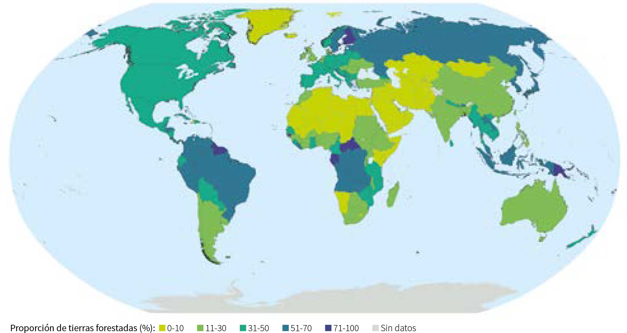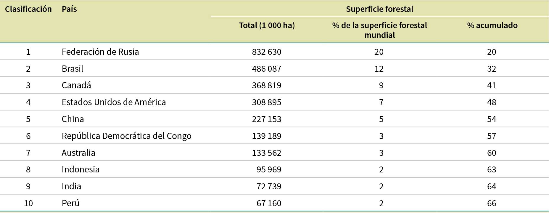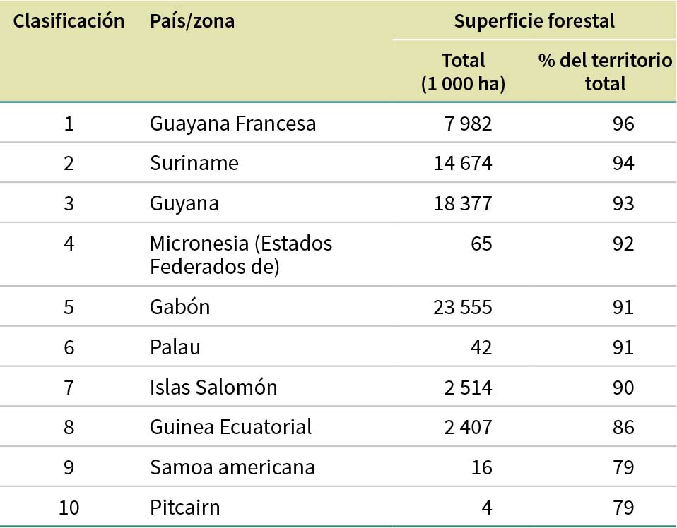 Más de la mitad (54 %) de la superficie forestal mundial se encuentra en solo cinco países (en orden descendente): la Federación de Rusia, el Brasil, el Canadá, los Estados Unidos de América y China (estos son también los cinco países más grandes en cuanto a superficie de tierra, aunque no en el mismo orden7). Los 10 países con la mayor superficie forestal representan unos dos tercios (el 66 %) del total mundial (Cuadro 3). Siete países y zonas (Gibraltar, las Islas Malvinas [Falkland Islands]8, las Islas Svalbard y Jan Mayen, Mónaco, Nauru, la Santa Sede y Tokelau) comunicaron no tener bosques, y los bosques representan menos del 10 % del territorio total en otros 49 países y zonas. En el Cuadro 4 se muestran los 10 países y zonas principales por superficie forestal como porcentaje del territorio total; de todos ellos, siete registran un valor del 90 % o superior.