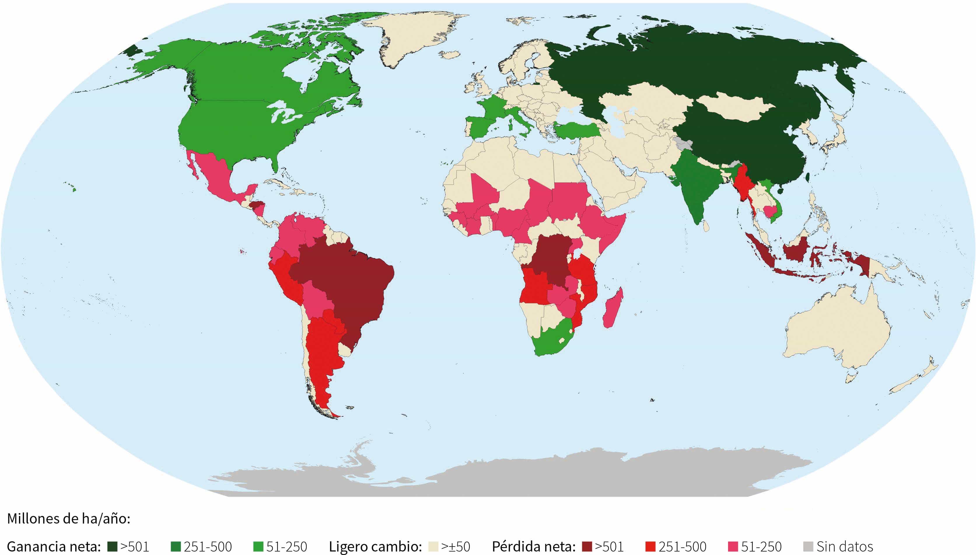 Para el presente informe, se analizaron las tendencias de la superficie forestal a lo largo de un período de 35 años dividido en tres bloques: 1990-2000, 2000-2015 y 2015-2025. Se disponía de estimaciones sobre la superficie forestal correspondientes a seis años de presentación de informes de la FRA (a saber, 1990, 2000, 2010, 2015, 2020 y 2025) para los 236 países y zonas (en el Cuadro 5 se muestran los valores correspondientes a esos años por región y subregión). La tasa de pérdida neta de bosques disminuyó en todo el mundo, pasando de 10,7 millones de ha por año en 1990-2000 a 3,68 millones de ha por año en 2000-2015, debido principalmente a los grandes incrementos de la superficie forestal en el Canadá, China, la Federación de Rusia y los Estados Unidos de América. La tasa anual de pérdida neta de bosques aumentó en 2015-2025 hasta los 4,12 millones de ha, debido a una reducción de la tasa de ganancia forestal (esto es, la forestación y la expansión natural de los bosques). En China, por ejemplo, la ganancia forestal neta descendió de 2,22 millones de ha por año en 2000-2015 a 1,69 millones de ha por año en 2015-2025; en el Canadá, la ganancia forestal neta cayó, pasando de 513 000 ha por año en 2000-2015 a 82 500 ha por año en 2015-2025. En los Estados Unidos de América, una ganancia forestal neta de 437 000 ha por año en 2000-2015 se convirtió en una pérdida neta de bosques de 120 000 ha por año en el decenio más reciente. En la Figura 5 se muestra el cambio neto anual de la superficie forestal por país y zona en el período 1990-2025.