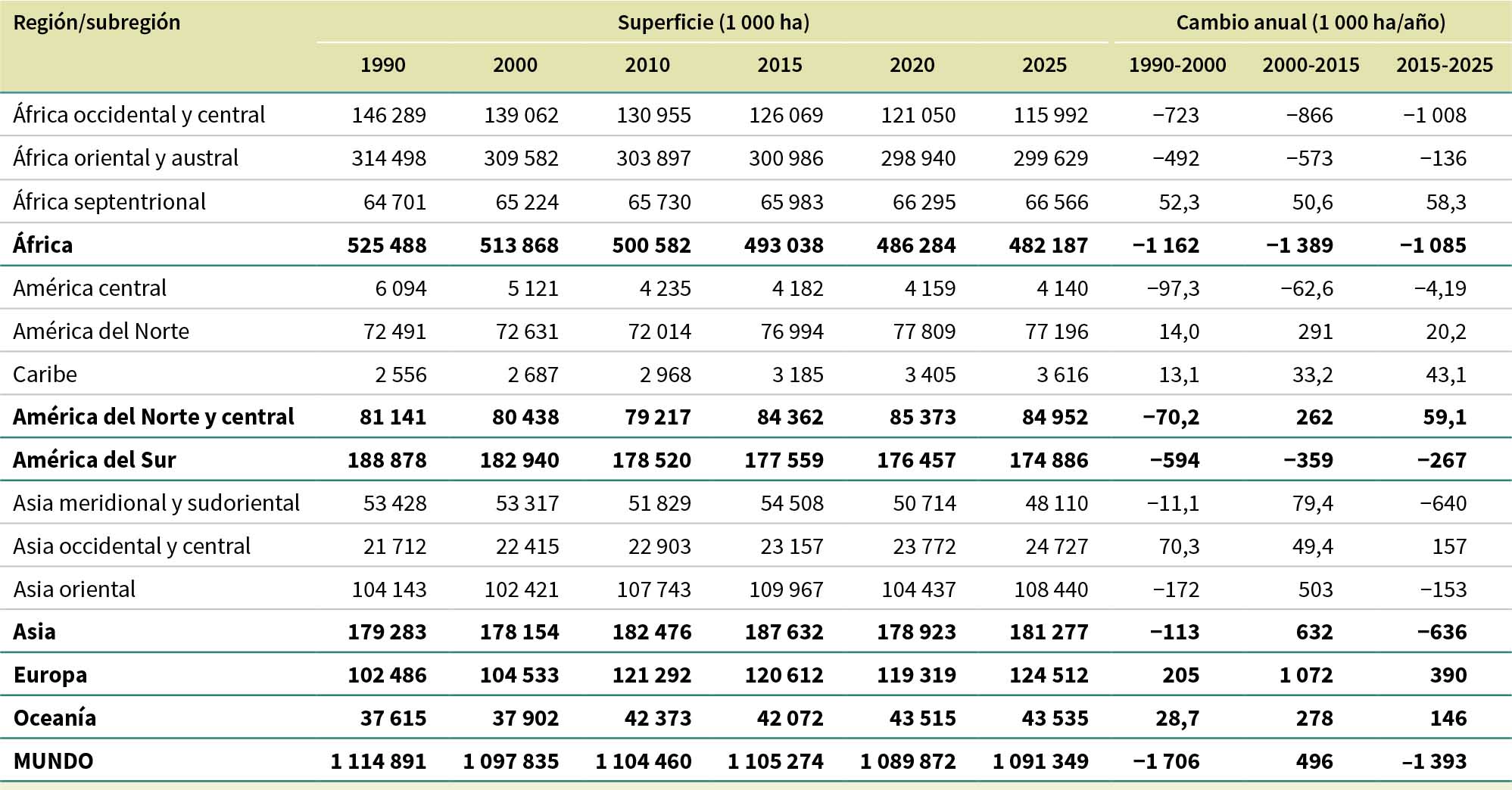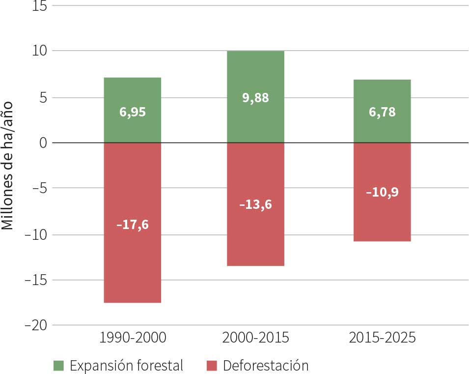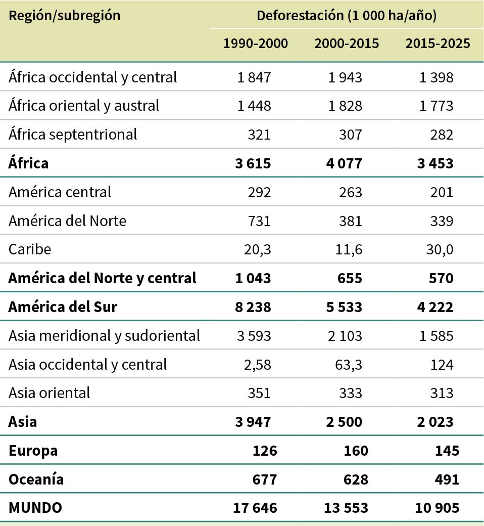 Se estima que entre 1990 y 2025 se perdieron 489 millones de ha de bosque a causa de la deforestación, aunque la tasa se redujo a lo largo del período. La deforestación se produjo a una tasa anual de 17,6 millones de ha en 1990-2000, 13,6 millones de ha en 2000-2015 y 10,9 millones de ha en 2015-2025 (Figura 7).