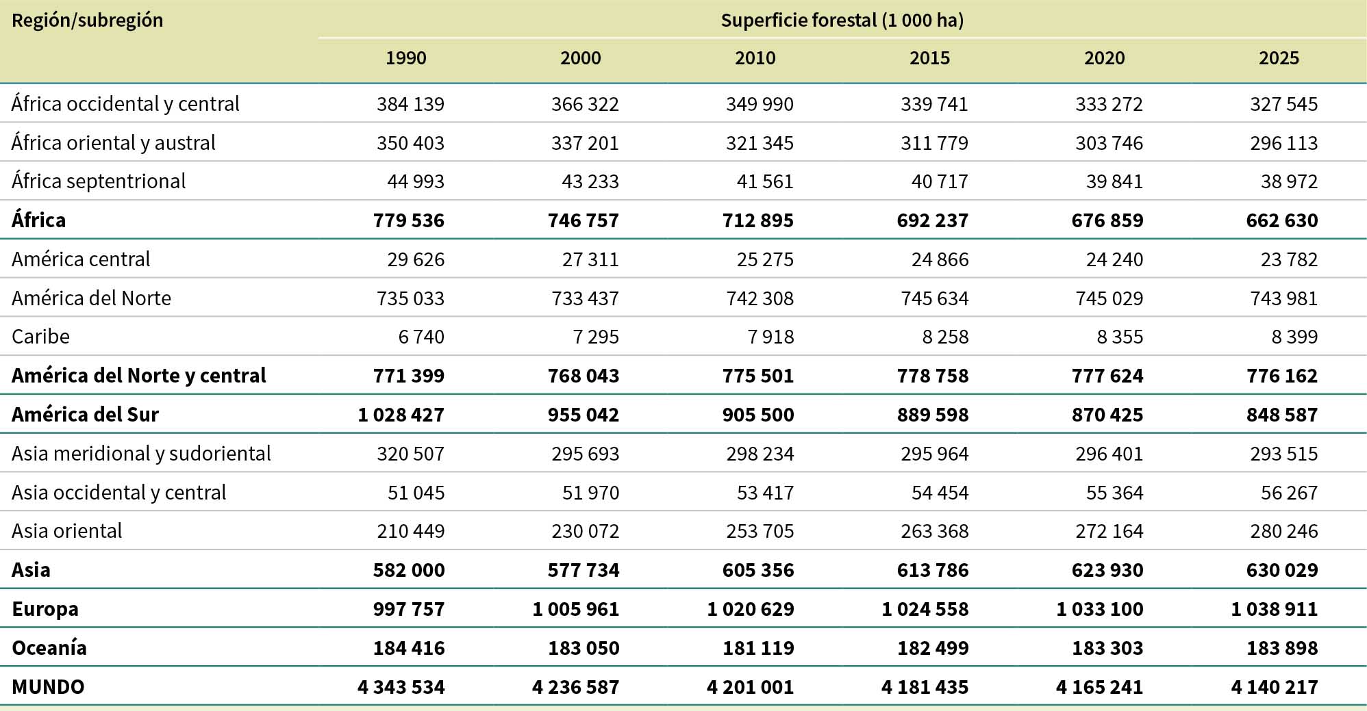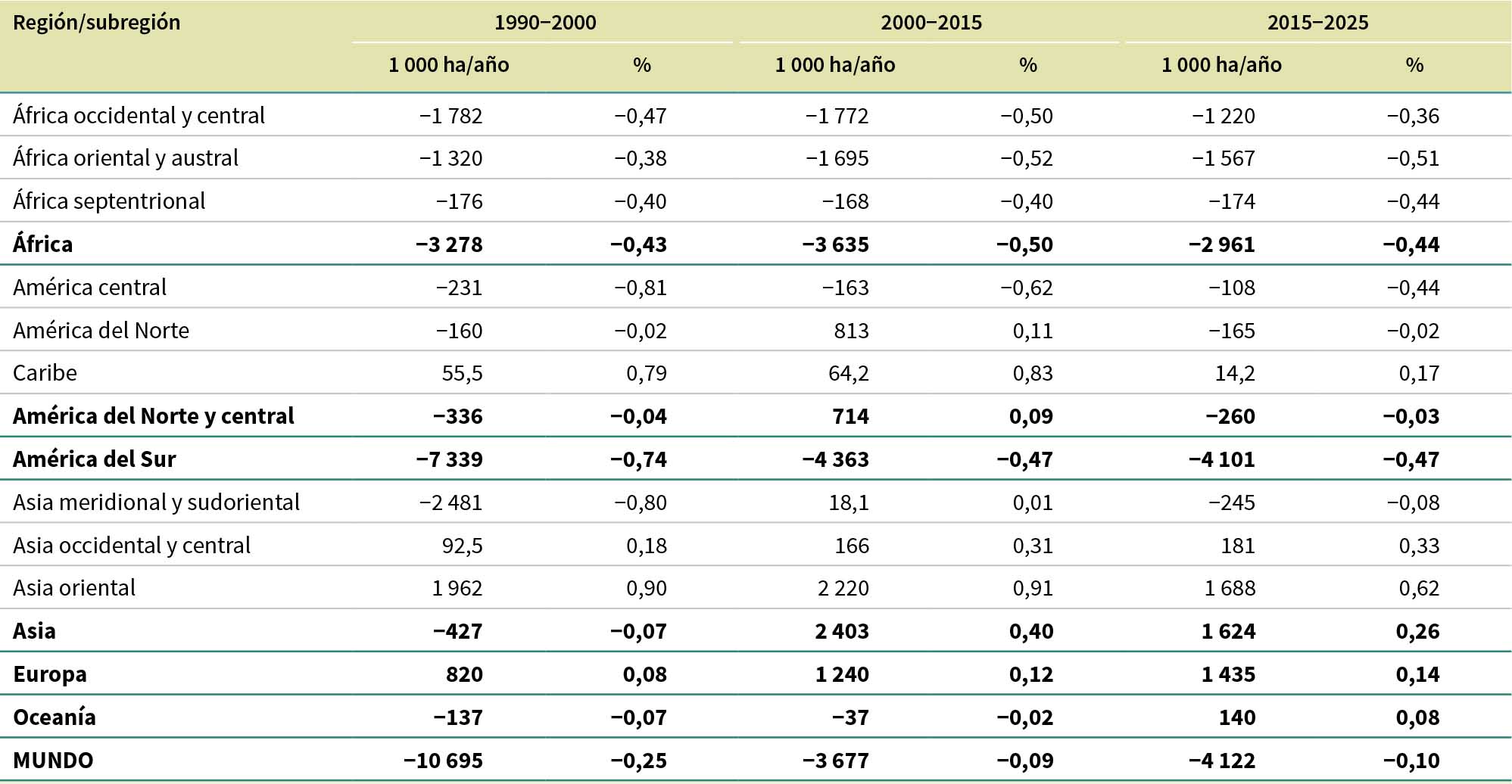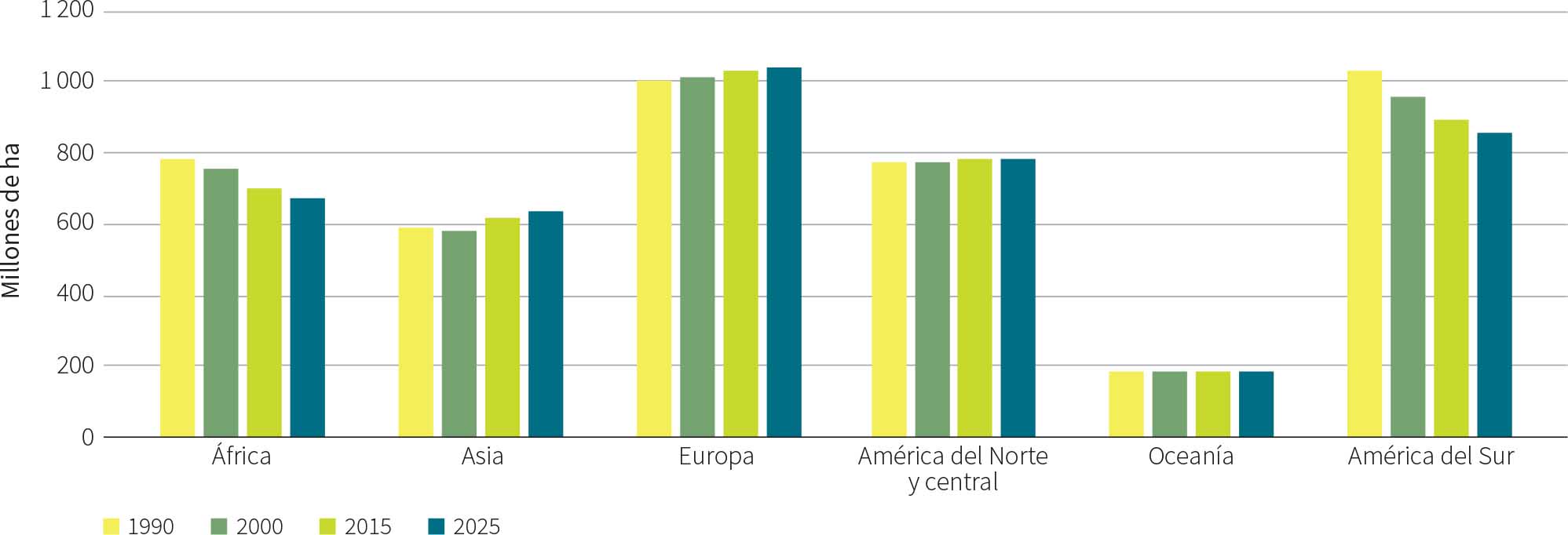 Se estima que entre 1990 y 2025 se perdieron 489 millones de ha de bosque a causa de la deforestación, aunque la tasa se redujo a lo largo del período. La deforestación se produjo a una tasa anual de 17,6 millones de ha en 1990-2000, 13,6 millones de ha en 2000-2015 y 10,9 millones de ha en 2015-2025 (Figura 7).