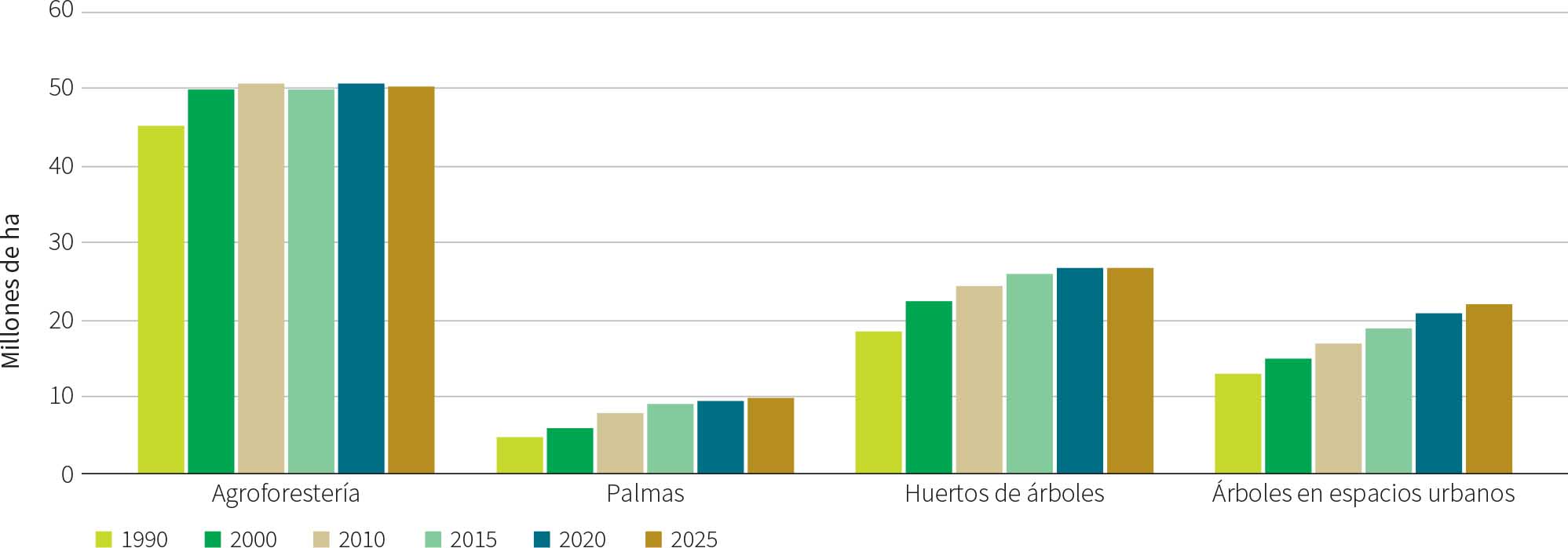 En la Figura 8 se muestran las tendencias, a escala mundial, de la superficie de otras tierras con cobertura arbórea entre 1990 y 2025.