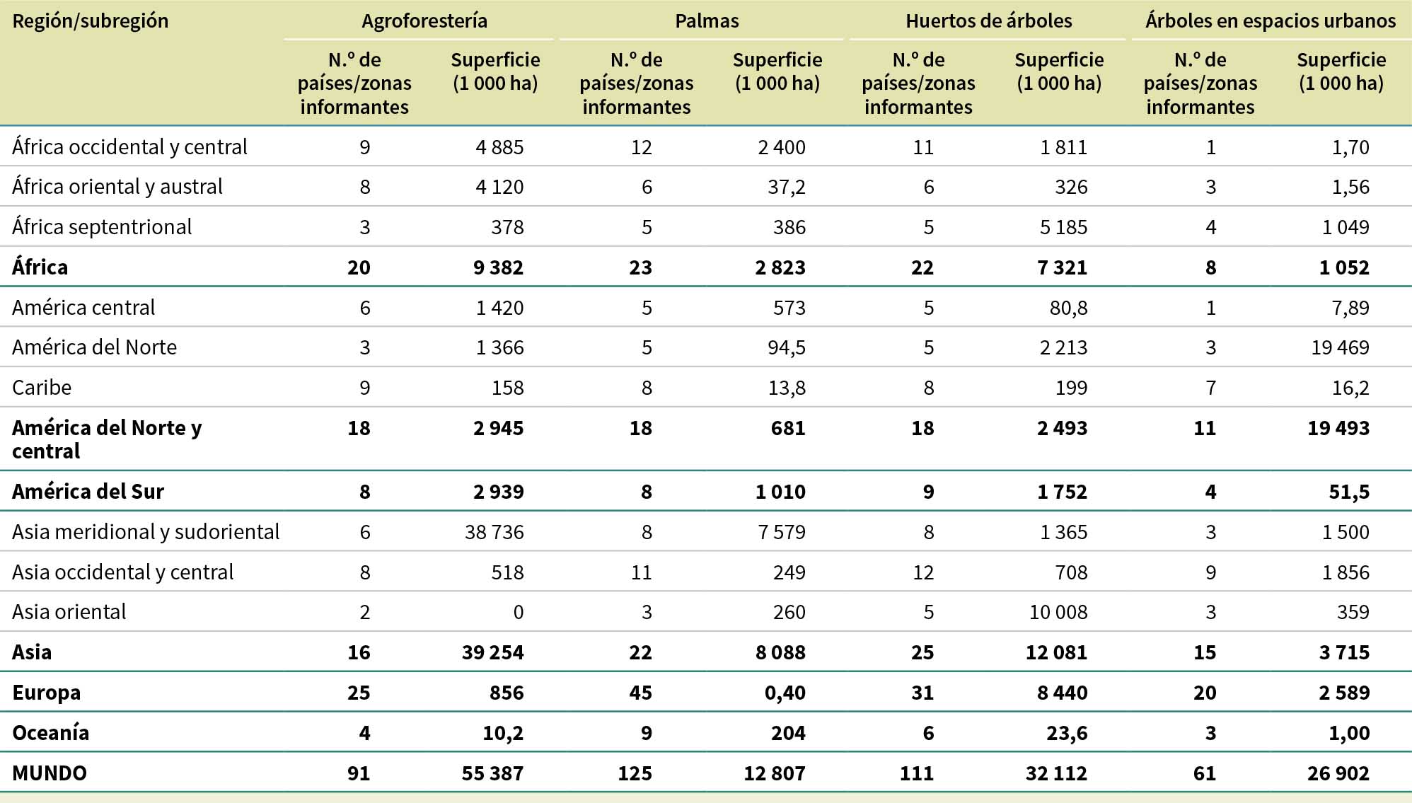 Sesenta y un países y zonas comunicaron datos sobre árboles en espacios urbanos, con un total de 26,9 millones de ha, de las cuales más del 70 % (19,5 millones de ha) se encontraba en América del Norte y central.