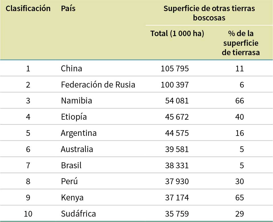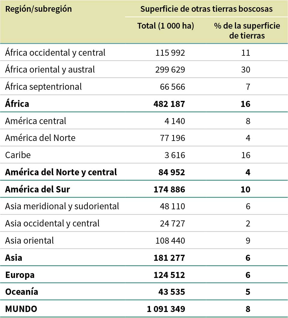 Para la FRA 2025 se recibió información de los 236 países y zonas sobre la superficie de otras tierras boscosas en 2025. Se estima que la superficie de otras tierras boscosas en todo el mundo es de 1 090 millones de ha, lo que representa el 8 % del territorio total (Cuadro 12). África tiene la mayor superficie de otras tierras boscosas (482 millones de ha), seguida de Asia (181 millones de ha), América del Sur (175 millones de ha), Europa (125 millones de ha), América del Norte y central (85,0 millones de ha) y Oceanía (43,5 millones de ha). En el Cuadro 13 se muestran los 10 países con la mayor superficie de otras tierras boscosas, cinco de los cuales (Australia, el Brasil, China, la Federación de Rusia y el Perú) también están entre los 10 con la mayor superficie forestal.