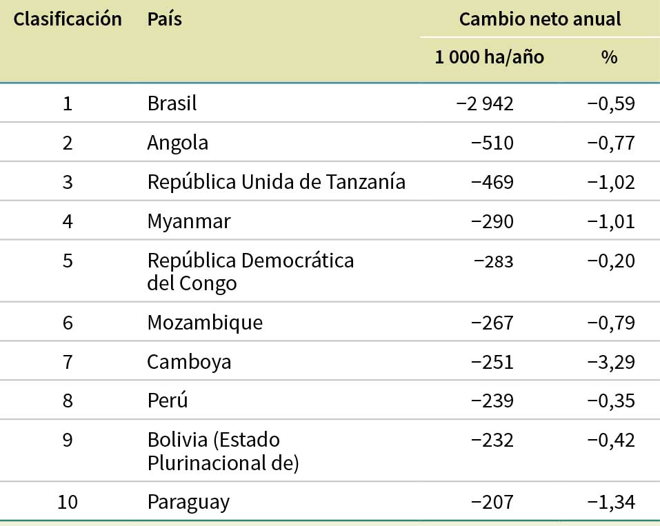 En el Cuadro 7 se muestran los 10 países del mundo con mayor pérdida neta anual media de superficie forestal entre 2015 y 2025, mientras que en el Cuadro 8 se muestran los 10 países con mayor ganancia neta anual media de superficie forestal en el mismo período.