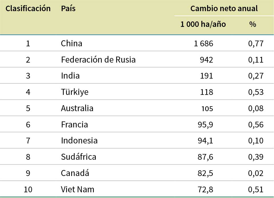 Los cambios en la superficie forestal a lo largo del tiempo reflejan los cambios en la demanda de tierra destinada a actividades forestales y otros usos, pero, por sí solo, este parámetro es insuficiente para describir y explicar las complejas dinámicas del uso de la tierra. Se necesita información adicional para comprender cuánto bosque se ha perdido debido a la conversión a otros usos de la tierra y cuánto se ha ganado gracias a la expansión natural y la forestación. En el presente capítulo se ofrece una síntesis de tales dinámicas, presentando estimaciones tanto de la deforestación como del cambio neto de la superficie forestal a escalas regional y mundial (Recuadro 3). También se proporcionan datos sobre dos categorías no forestales, “otras tierras boscosas” y “otras tierras con cobertura arbórea” (véase FAO, 2023b para consultar las definiciones de estos y otros términos empleados en esta publicación), que en ambos casos constituyen recursos importantes en muchos países.