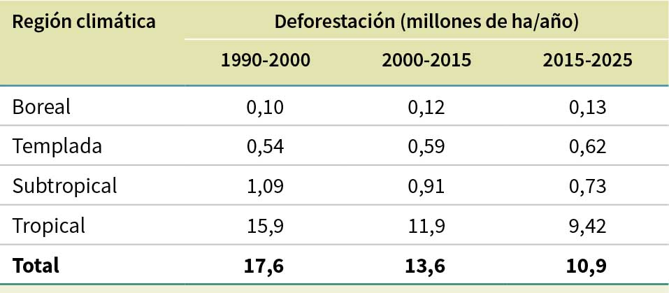 La mayor parte de la deforestación registrada entre 1990 y 2025 (88 %) tuvo lugar en la región tropical, aunque la tasa anual de deforestación de esta región descendió de 15,9 millones de ha en 1990-2000 a 11,9 millones de ha en 2000-2015 y 9,42 millones de ha en 2015-2025 (Cuadro 9). La tasa anual de deforestación descendió en la región subtropical, de 1,09 millones de ha en 1990-2000 a 0,73 millones de ha en 2015-2025, pero aumentó ligeramente en las regiones templada y boreal.