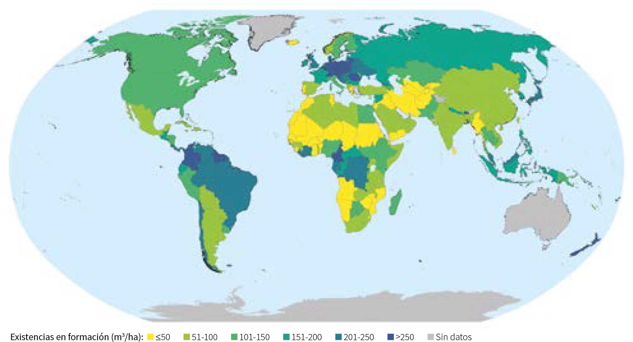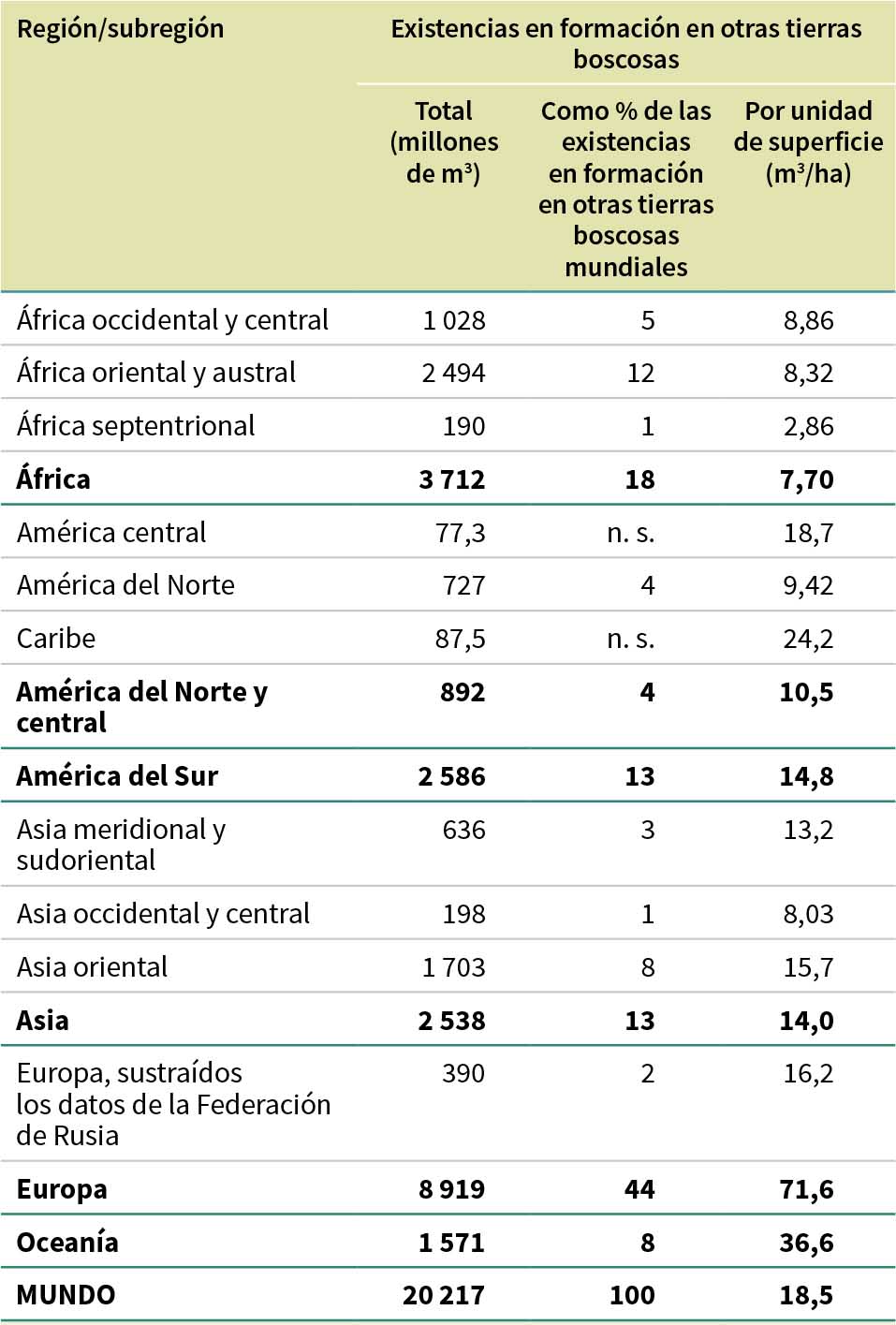 Las existencias medias en formación por unidad de superficie en otras tierras boscosas se estiman en 19 m3 por ha a escala mundial, y los promedios oscilan entre los 3 m3 por ha (África septentrional) y los 72 m3 por ha (Europa).