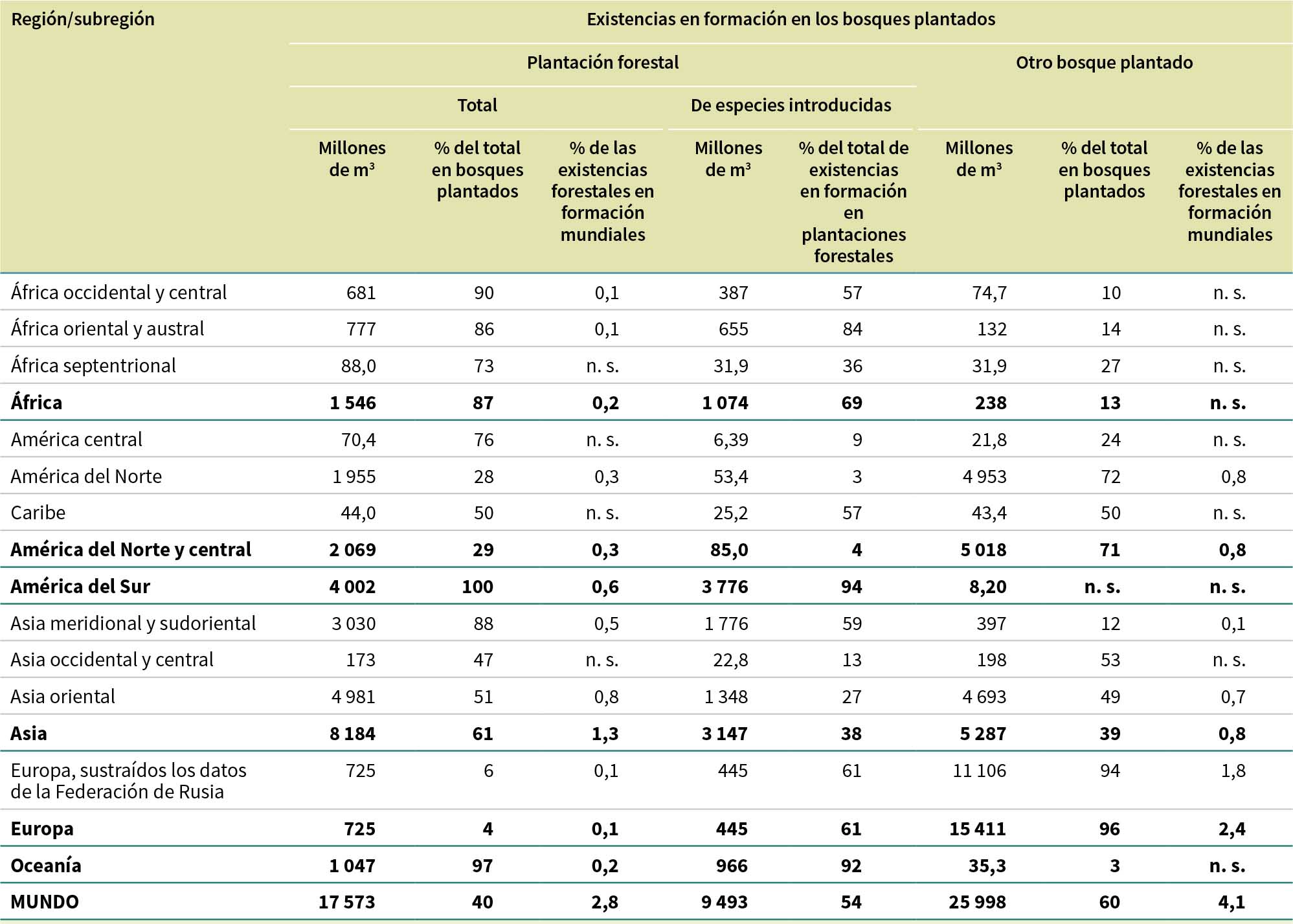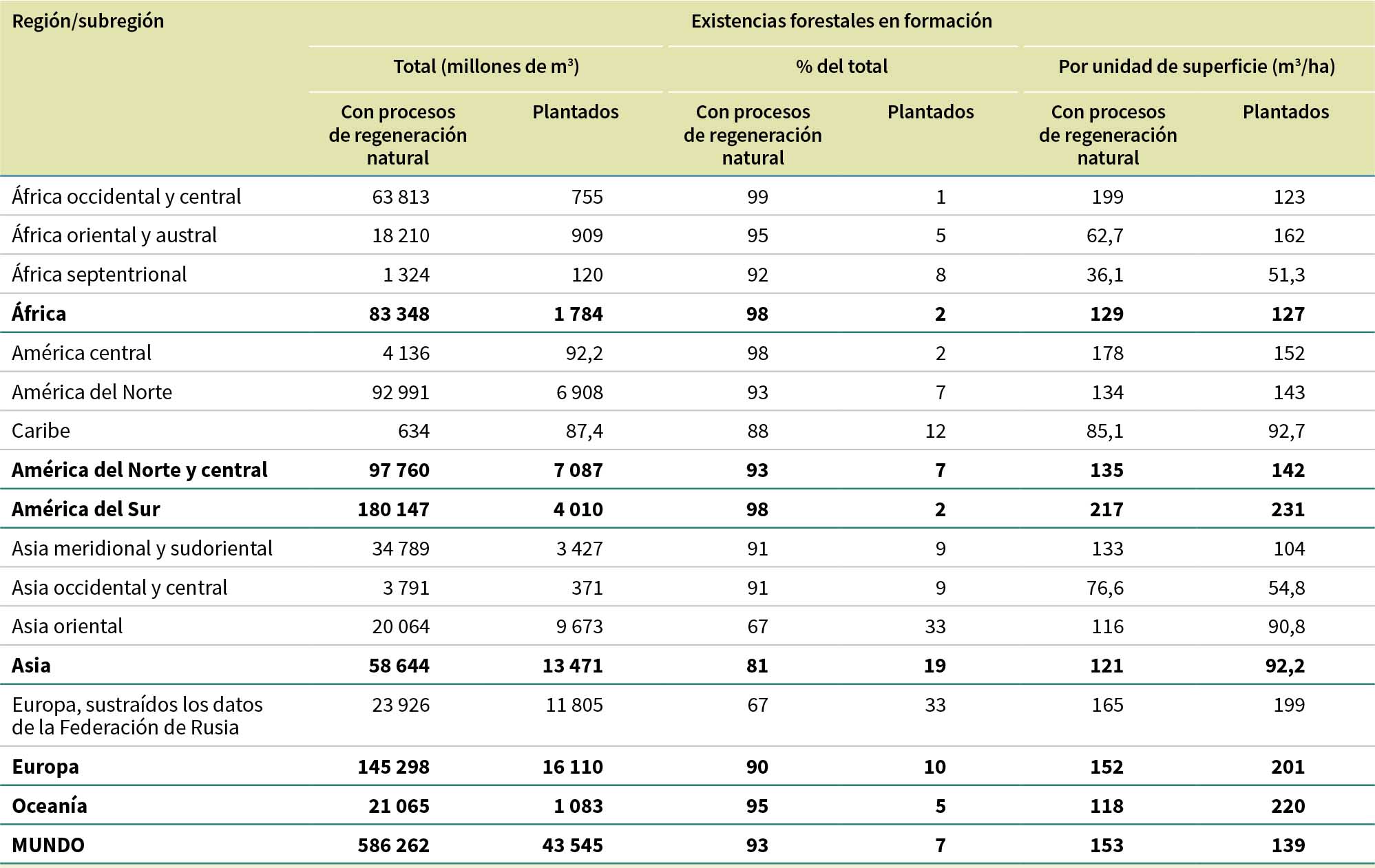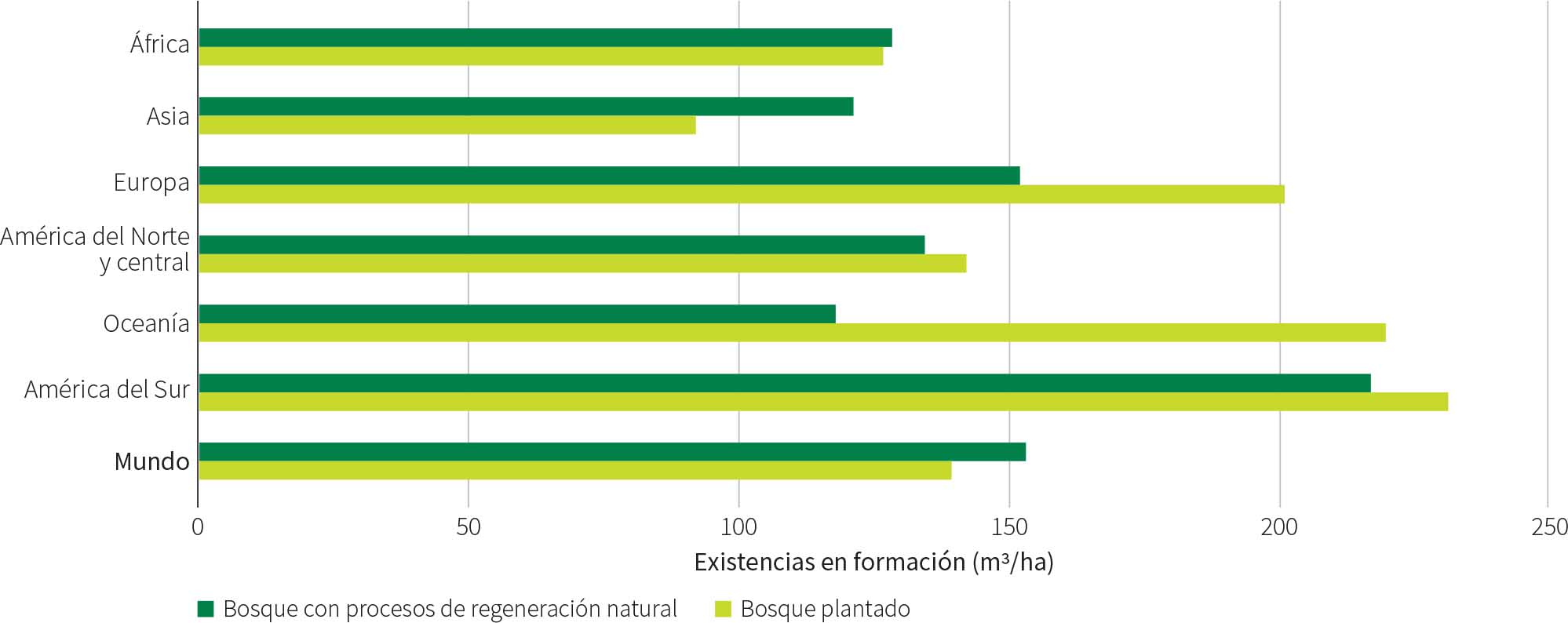 A escala mundial, la densidad de las existencias medias en formación es más elevada en otros bosques plantados (168 m3 por ha) que en las plantaciones forestales (112 m3 por ha), aunque esto varía en función de la región. Las plantaciones forestales compuestas de especies introducidas, que suelen tener un crecimiento más rápido, muestran densidades más elevadas de existencias en formación (146 m3/ha) que el promedio general de las plantaciones forestales.