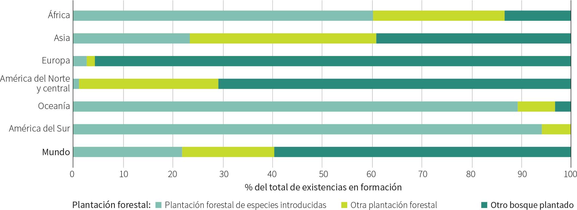 De las regiones, Asia registra el mayor volumen de existencias en formación en las plantaciones forestales, con 8 180 millones de m3, lo que representa el 47 % de las existencias en formación en las plantaciones forestales mundiales, seguida de América del Sur (3 780 millones de m3 o un 23 %). Casi todas (99,8 %) las existencias en formación en los bosques plantados en América del Sur se encuentran en plantaciones forestales; las proporciones también son elevadas en Oceanía (97 %) y África (87 %) (Figura 20). En cambio, las plantaciones forestales constituyen solo un pequeño porcentaje (5 %) de las existencias en formación en los bosques plantados en Europa.