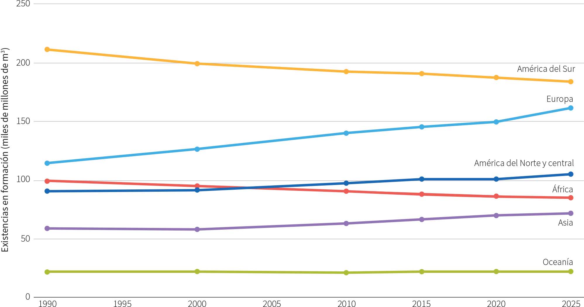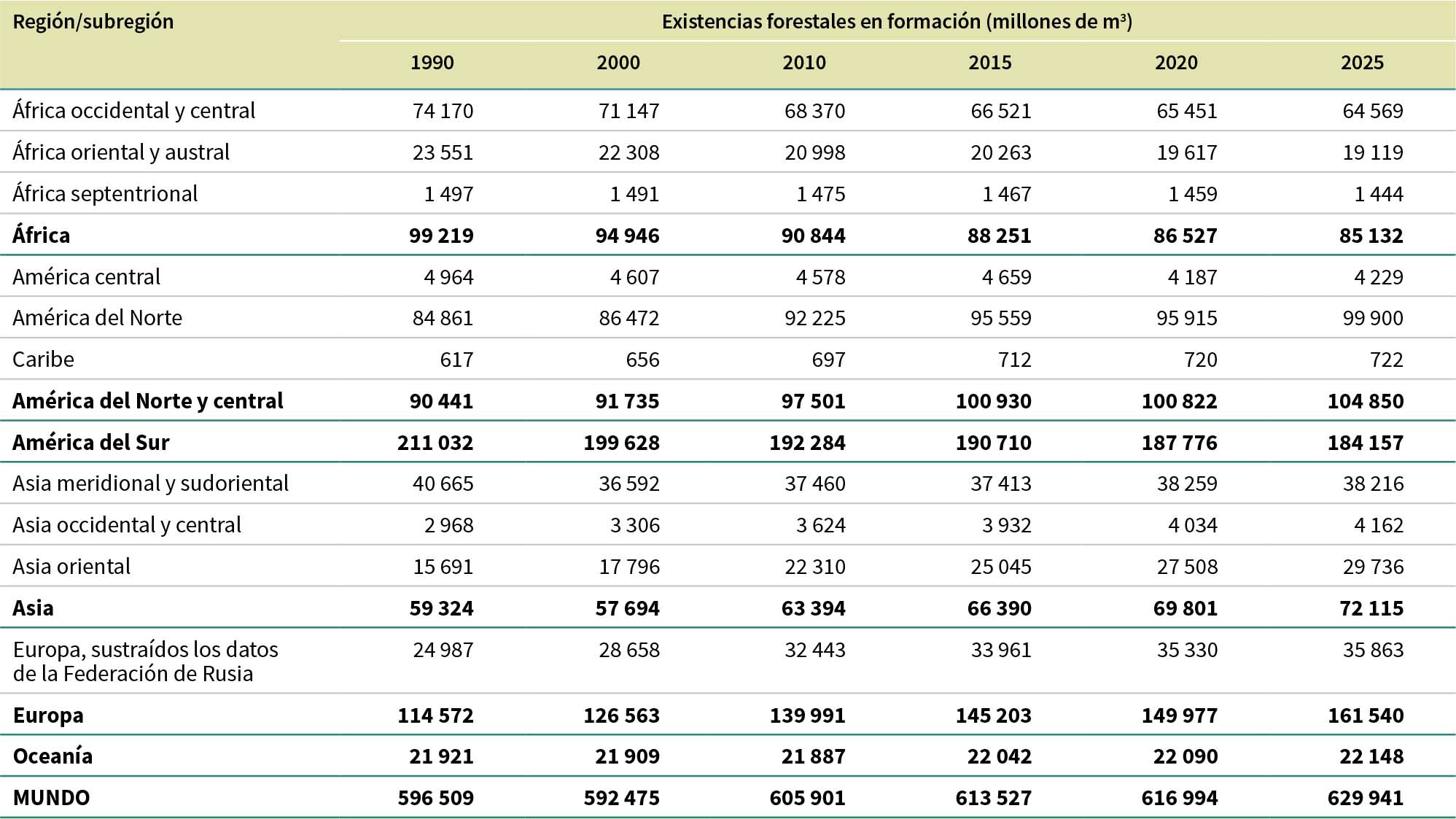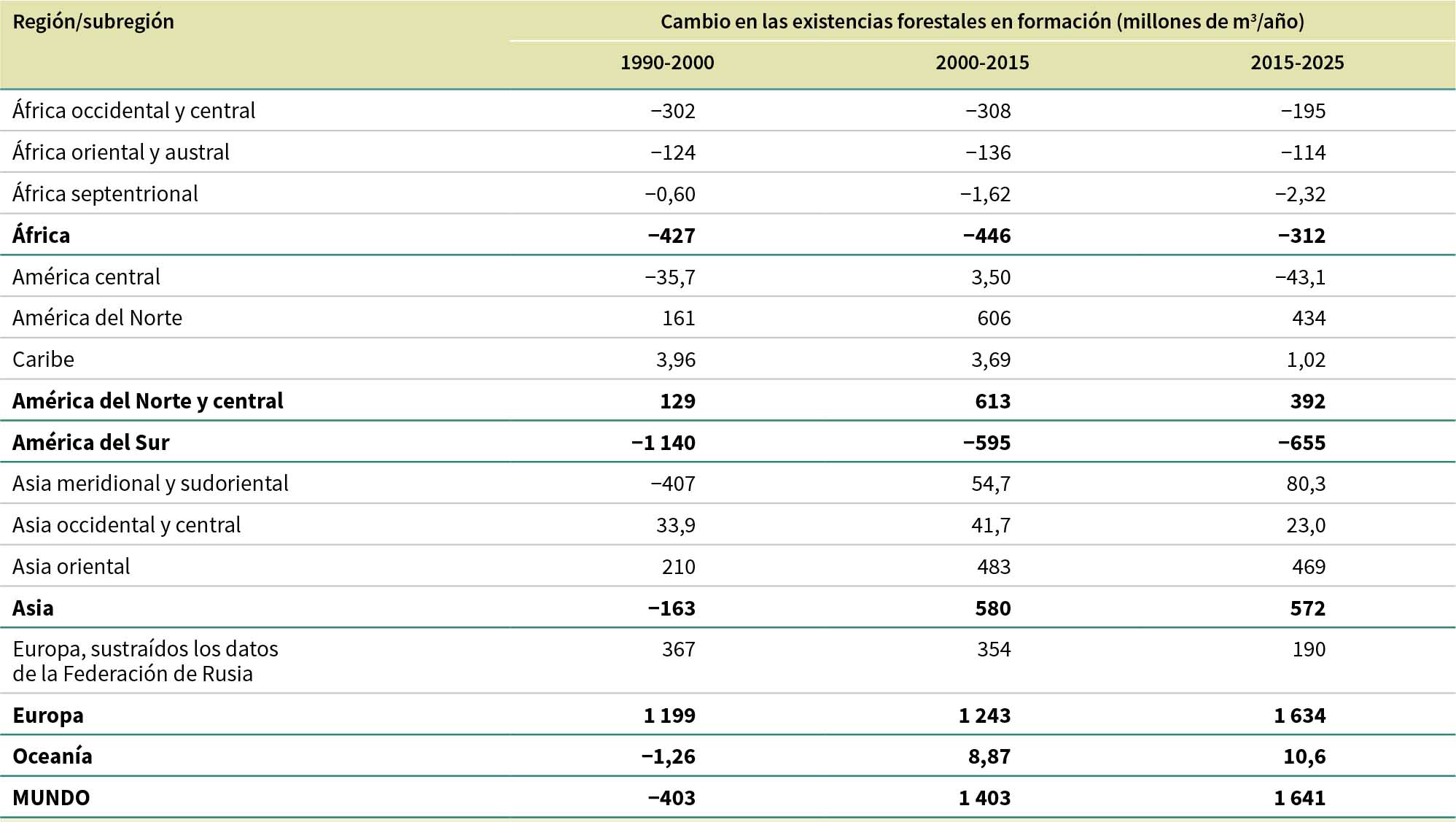 Tras un descenso en la década de 1990, el volumen de existencias forestales en formación a escala mundial aumentó de manera significativa entre 2000 y 2025, pasando de 592 000 millones de m3 a 630 000 millones de m3. No obstante, se observaron patrones regionales contrapuestos, con incrementos sustanciales en Europa (sobre todo en la Federación de Rusia), América del Norte y Asia a lo largo del período y marcados descensos en América del Sur y África (Cuadro 42, Cuadro 43 y Figura 21). Algunas subregiones tropicales, como África occidental y central, experimentaron una ralentización del descenso medio anual de las existencias en formación en 2015-2025 en comparación con 2000-2015. Por el contrario, la tasa de descenso de las existencias forestales en formación se aceleró en América del Sur entre los dos períodos. En América central, el cambio de las existencias forestales en formación fue positivo en 2000-2015 (con 3,5 millones de m3 por año) y negativo en 2015-2025 (con 43,1 millones de m3 por año).