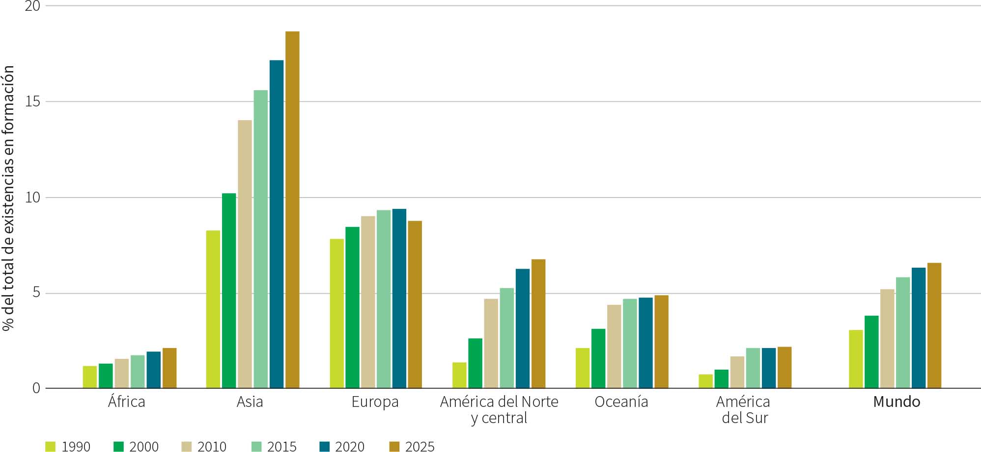 En el mundo, el 93 % de las existencias en formación totales en 2025 se encuentra en bosques con procesos de regeneración natural, y las que se encuentran en los bosques plantados representan el 7 %. A escala mundial, las existencias medias en formación por unidad de superficie son más elevadas en los bosques con procesos de regeneración natural (153 m3 por ha) que en los bosques plantados (139 m3 por ha) (Cuadro 38). Esto se debe en parte al incremento mundial de los bosques plantados en los últimos decenios, pues los bosques plantados más jóvenes todavía no han alcanzado un volumen de existencias en formación máximo, y en parte a la mayor frecuencia de extracción en los bosques plantados. De las regiones, Asia comunicó la mayor proporción de existencias en formación en los bosques plantados (19 %), impulsada por Asia oriental. África y América del Sur comunicaron las proporciones más bajas (Figura 18 y Figura 19).