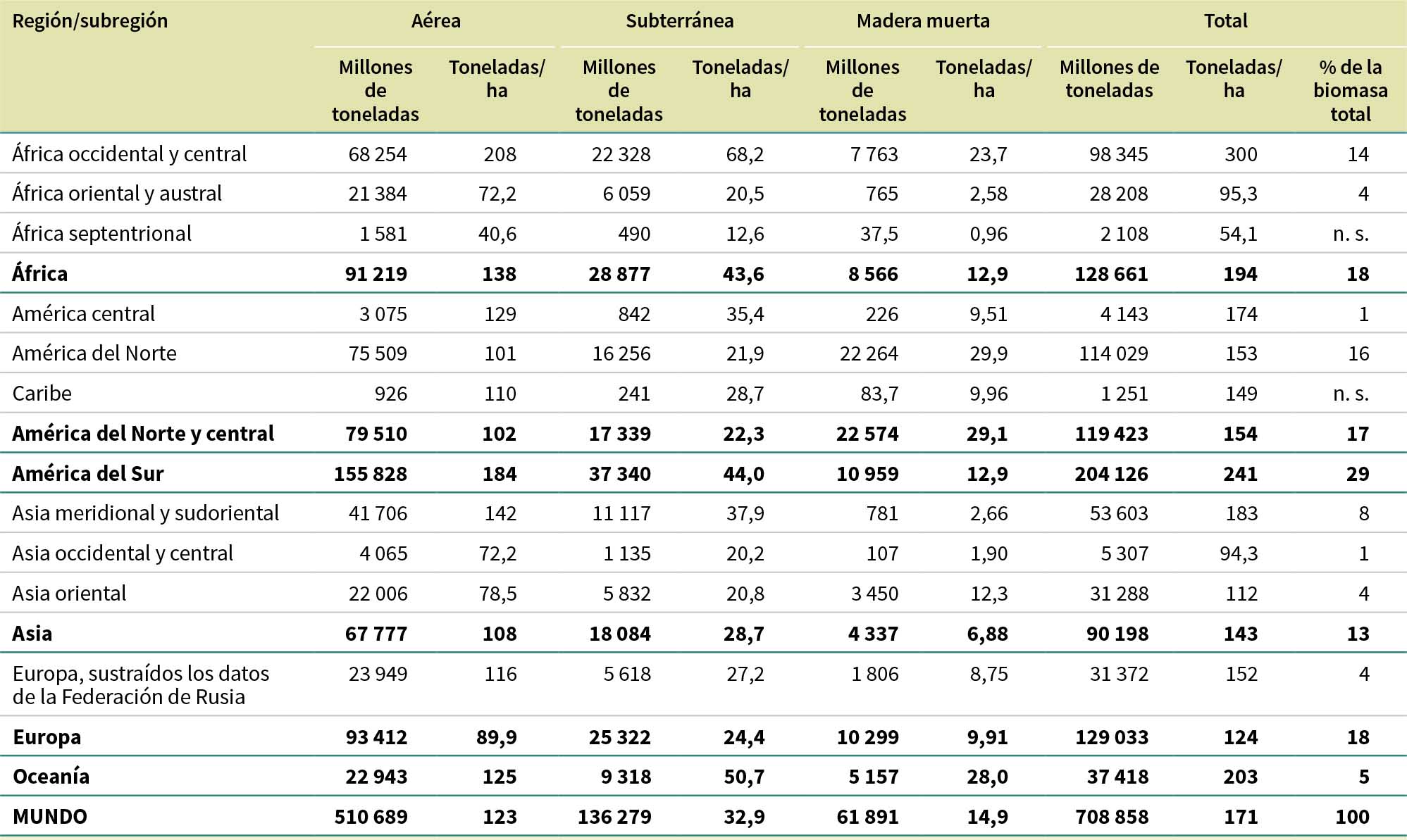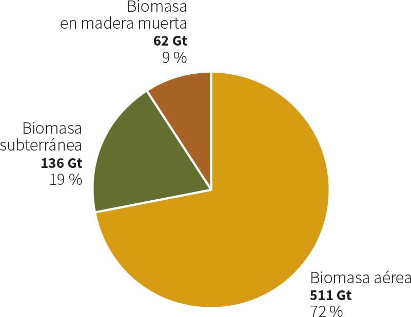 La biomasa total en los bosques del mundo se estima en aproximadamente 709 gigatoneladas (Gt), equivalentes a 171 toneladas por ha. La biomasa viva, que abarca la biomasa aérea y subterránea, representa cerca de 647 Gt, o aproximadamente 156 toneladas por ha (Cuadro 49). De este total, el 79 % corresponde a la biomasa aérea y el 21 % a la biomasa subterránea. La biomasa en la madera muerta en los bosques del mundo se estima en 61,9 Gt de materia seca, lo que equivale a 14,9 toneladas por ha y representa el 9 % de la biomasa forestal mundial (Figura 23).