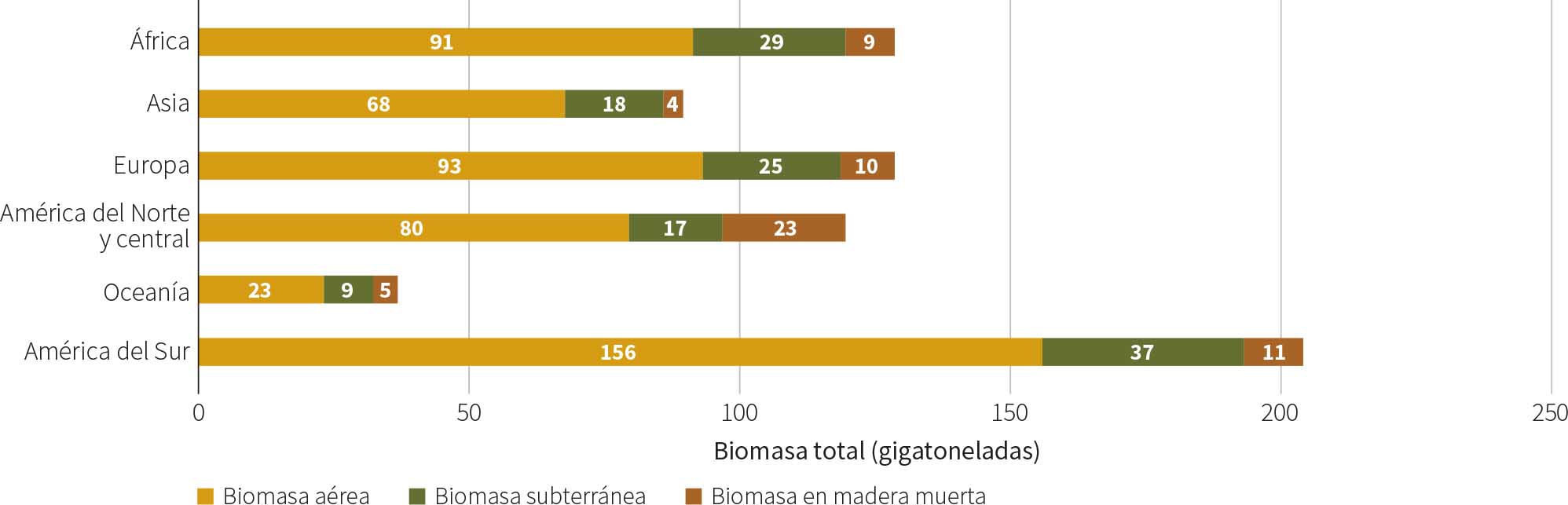 De las regiones, América del Sur posee el mayor porcentaje de biomasa forestal mundial, que representa cerca de un tercio del total (Figura 24). Las regiones con bosques tropicales muestran densidades de biomasa más elevadas, que superan las 200 toneladas por ha en Oceanía y América del Sur. La biomasa media por unidad de superficie en África es de 194 toneladas por ha, aunque alcanza las 300 toneladas por ha en África occidental y central.