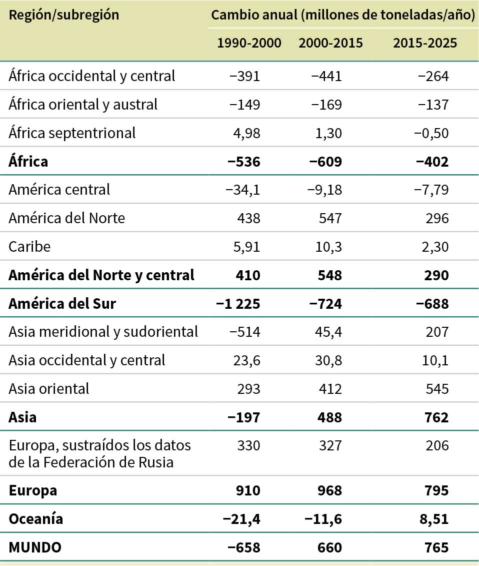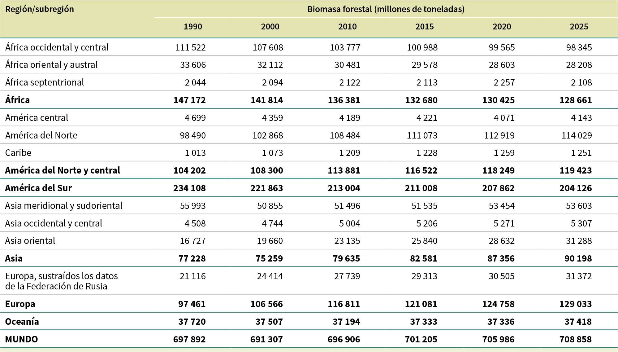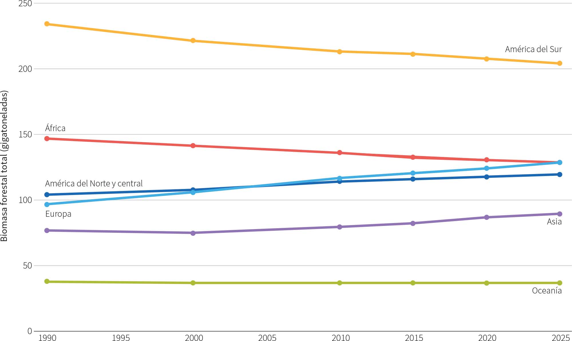 La tendencia mundial de la biomasa se revirtió de un descenso en la década de 1990 a incrementos constantes entre 2000 y 2025 (Cuadro 50). Las existencias de biomasa aumentaron aproximadamente 11,0 Gt entre 1990 y 2025 (Cuadro 51), un incremento del 1,6 %. No obstante, las tendencias regionales mostraron patrones contrapuestos. América del Sur y África experimentaron pérdidas significativas en las existencias de biomasa a lo largo del período: 857 millones de toneladas por año y 529 millones de toneladas por año, respectivamente (Cuadro 52), debido sobre todo a la pérdida de superficie forestal. Por el contrario, se produjeron incrementos sustanciales de la biomasa en Asia oriental, Europa y América del Norte, impulsados por expansiones de la superficie forestal e incrementos de la biomasa por unidad de superficie (Figura 25). La tendencia de las existencias de biomasa en Asia, especialmente en Asia meridional y sudoriental, se revirtió, pasando de descensos significativos en la década de 1990 a incrementos a lo largo del período 2000-2025.