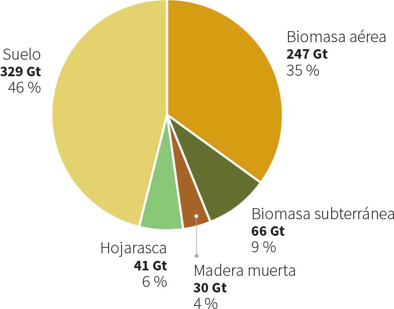 Las existencias de carbono totales en los bosques en 2025, incluidos todos los reservorios de carbono, se estiman en 714 Gt, lo que equivale a 172 toneladas por ha (Cuadro 54). Estas existencias se distribuyen de la siguiente manera: carbono orgánico en el suelo, 329 Gt (46 % del total) o 79,6 toneladas por ha; biomasa aérea, 247 Gt (35 %) o 59,7 toneladas por ha; biomasa subterránea, 65,9 Gt (9 %) o 15,9 toneladas por ha; hojarasca, 41,1 Gt (6 %) o 9,93 toneladas por ha, y madera muerta, 30,3 Gt (4 %) o 7,32 toneladas por ha (Figura 26).