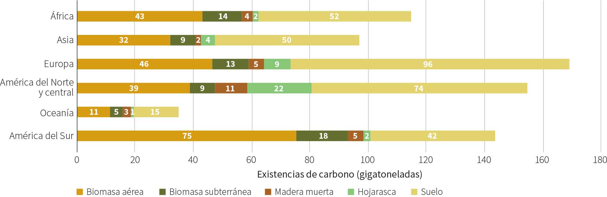 Las regiones con las mayores existencias de carbono en los bosques son Europa (24 % del total mundial), América del Norte y central (22 %) y América del Sur (20 %) (Figura 27). Las existencias de carbono por unidad de superficie son particularmente elevadas en África occidental y central, con 260 toneladas por ha, y América del Norte, con unas 200 toneladas por ha.