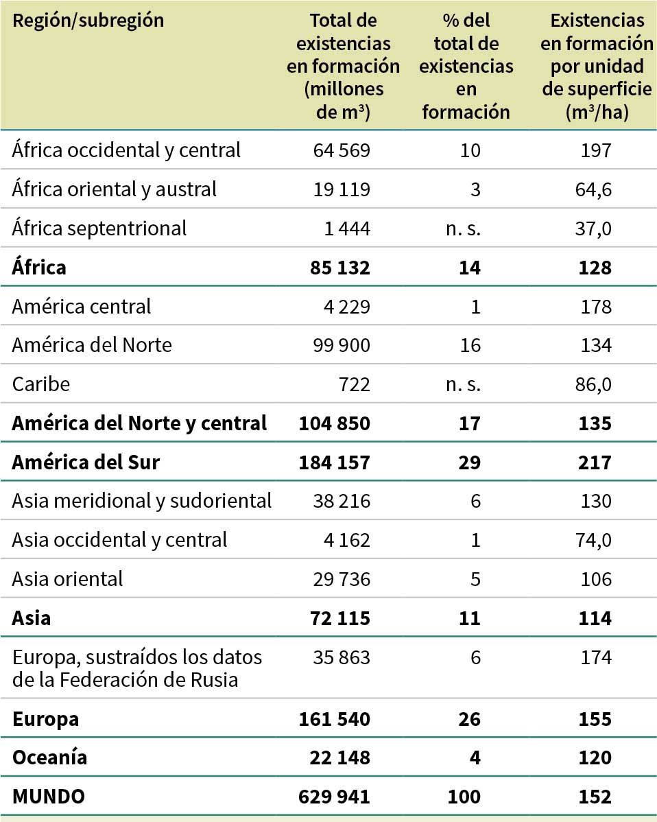 Se estima que el total de las existencias forestales en formación del mundo asciende a 630 000 millones de m3, y el mayor porcentaje se encuentra en América del Sur (29 %), seguida de Europa (26 %) (Cuadro 36 y Figura 17). A escala mundial, las existencias medias en formación por unidad de superficie se estiman en 152 m3 por ha; los valores más elevados se registran en las regiones tropicales, con América del Sur a la cabeza (217 m3 por ha), seguida de África occidental y central (197 m3 por ha) y América central (178 m3 por ha). De las regiones en las que predominan los bosques de zonas templadas y boreales, la cifra más elevada de existencias en formación por unidad de superficie se registra en Europa, sustraídos los datos de la Federación de Rusia, con 174 m3 por ha.