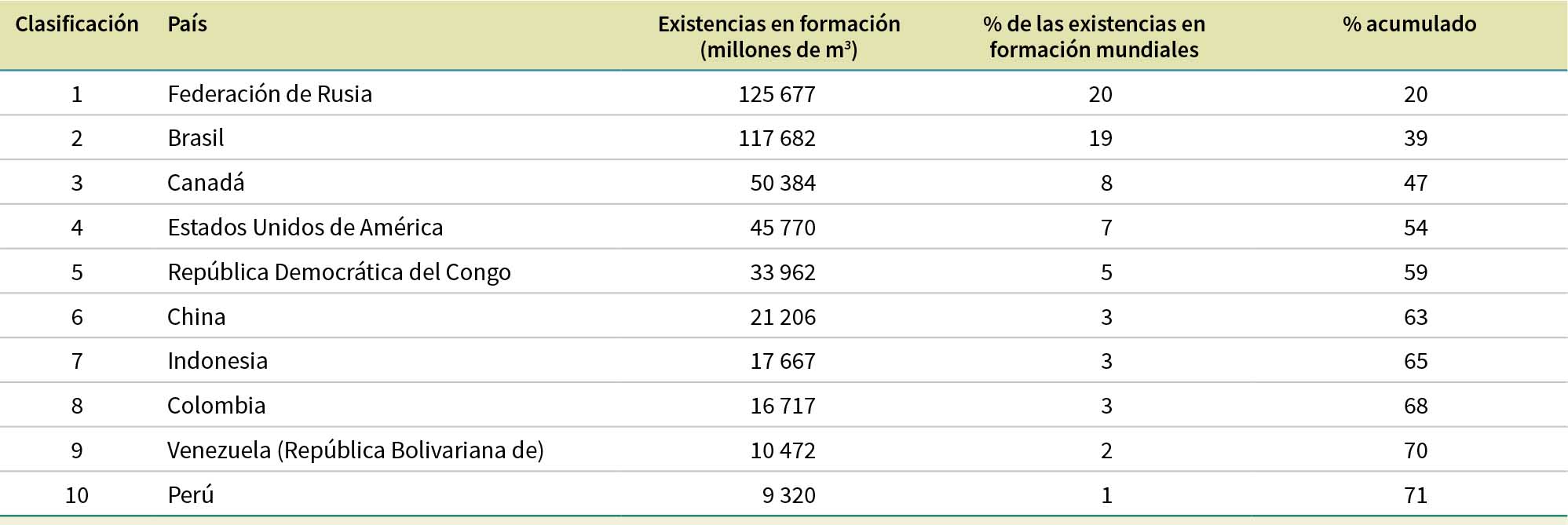 Casi el 40 % de las existencias en formación mundiales se sitúa en dos países: la Federación de Rusia (126 000 millones de m3, o cerca del 20 % del total mundial) y el Brasil (118 000 millones de m3). Otros países con un 5 % o más de las existencias en formación mundiales son (en orden descendente, por volumen) el Canadá, los Estados Unidos de América y la República Democrática del Congo (Cuadro 37).