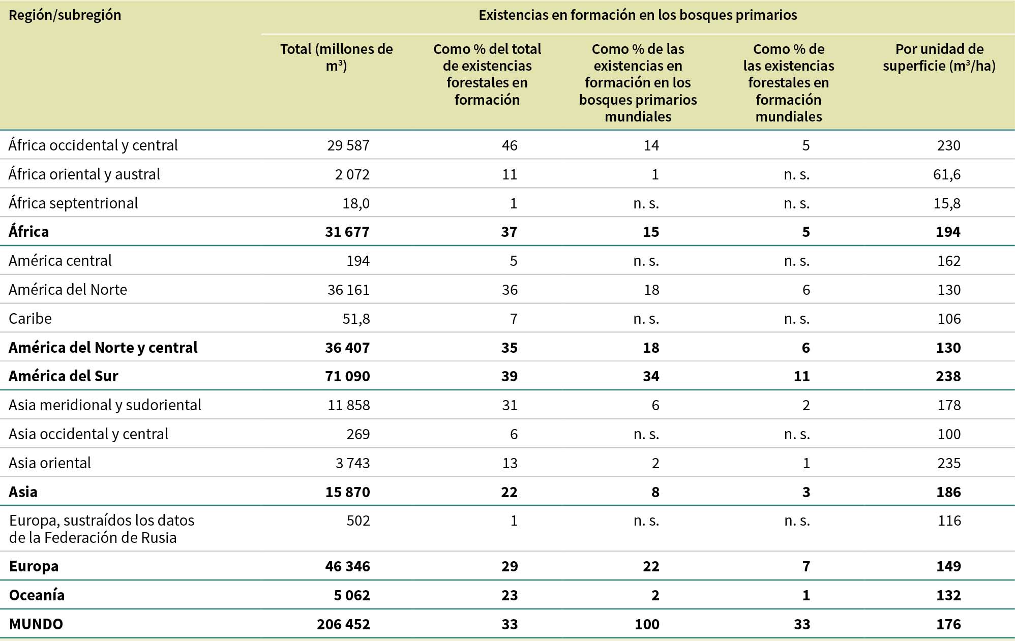 De las subregiones, África occidental y central destaca por su elevada proporción de existencias en formación totales en los bosques primarios (46 %). A escala mundial, las existencias medias en formación en los bosques primarios se estiman en 176 m3 por ha, con una densidad notablemente elevada en América del Sur (238 m3 por ha).