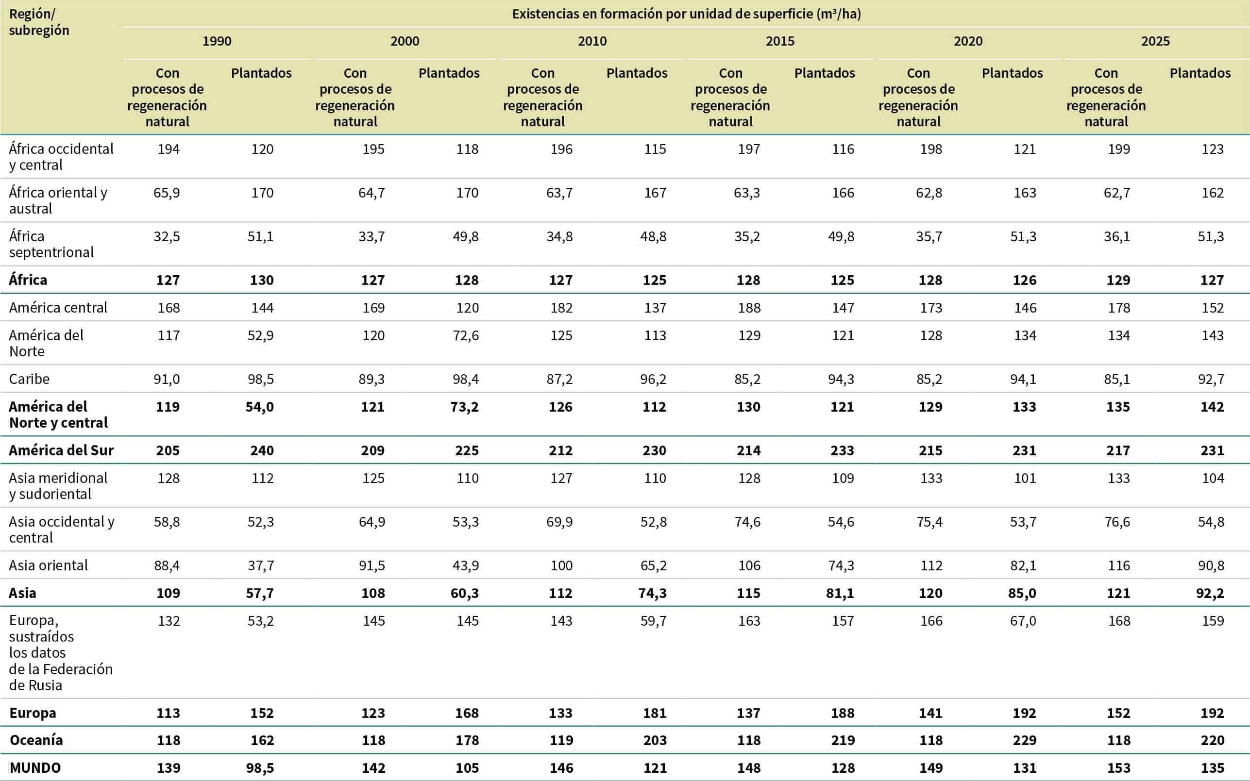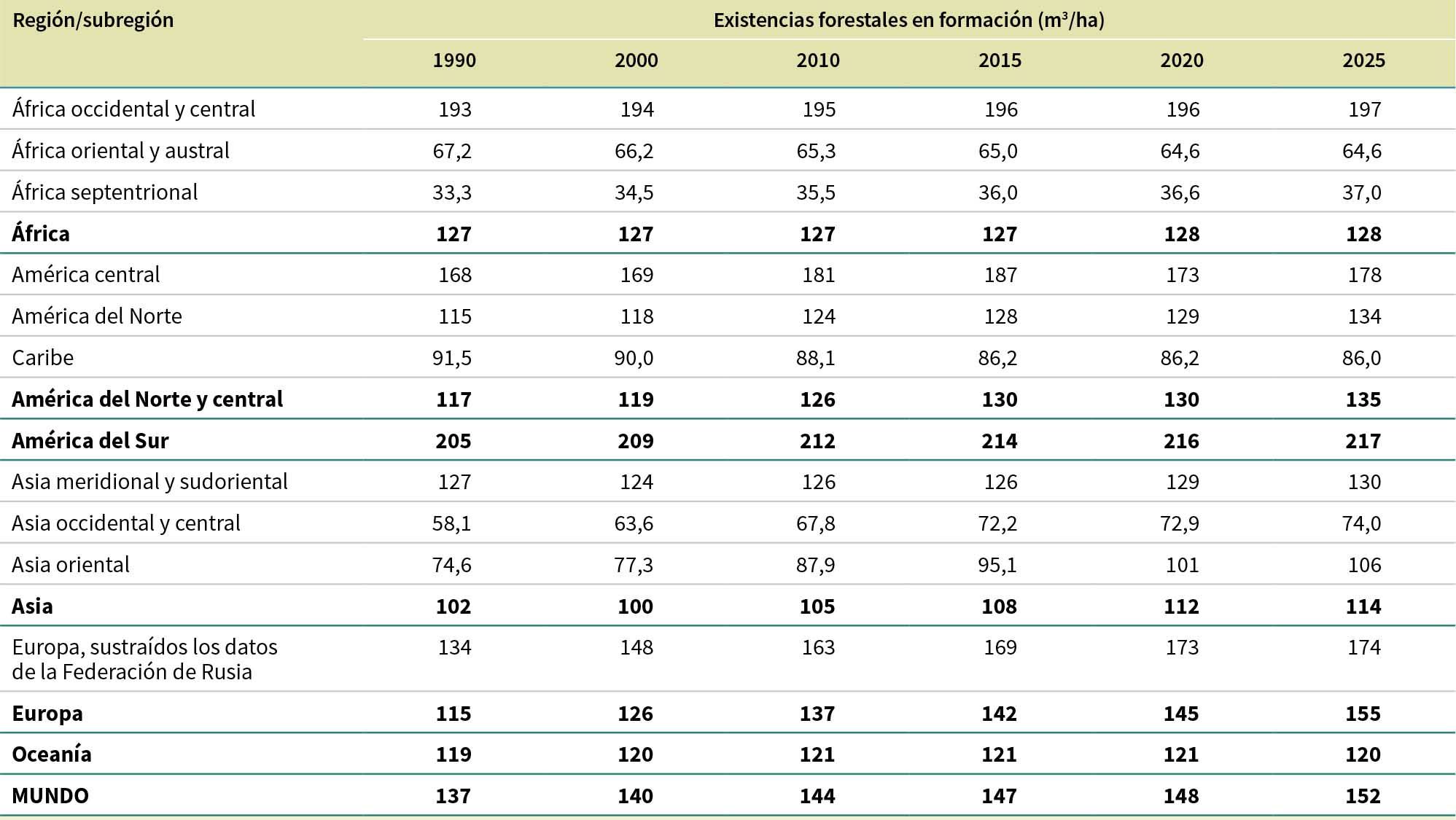Las existencias forestales en formación mundiales por unidad de superficie aumentaron un 11 % entre 1990 y 2025, y crecieron en todas las regiones y casi todas las subregiones (Cuadro 44). El incremento fue especialmente marcado en Europa y Asia oriental, probablemente debido a factores como, por ejemplo, la mejora de la gestión forestal y, especialmente en China (Lu et al., 2018; Yue, Zhang y Shao, 2021), los programas de reforestación a gran escala. Las existencias en formación por ha también aumentaron significativamente en la Federación de Rusia y los Estados Unidos de América en 2015-2025.